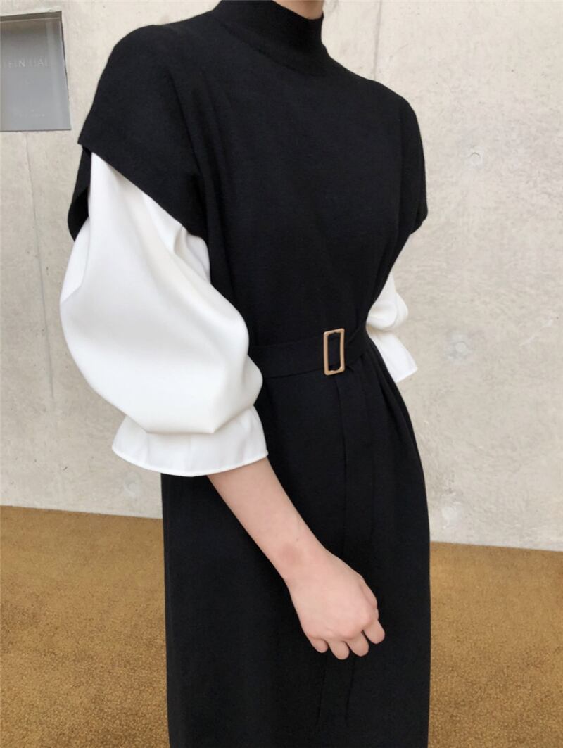 幅広い用途で使える白ブラウスと黒ニットワンピースのセットアップ