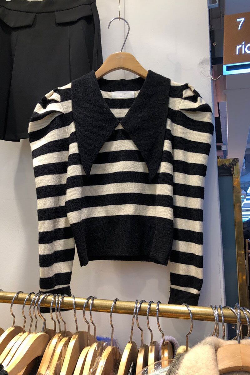 大きな襟と太めのボーダーが印象的なニットプルオーバー&カーディガン。