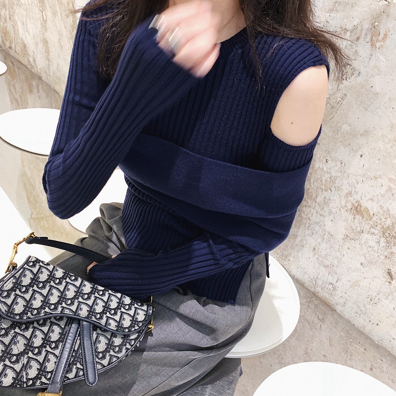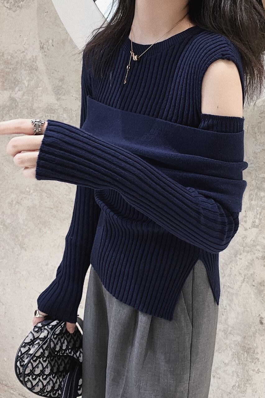 重ねデザインとオープンショルダーが目を惹くニットトップス。