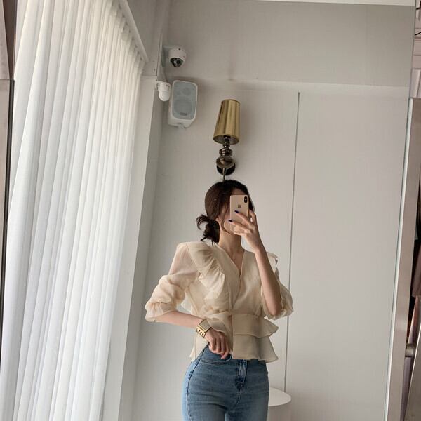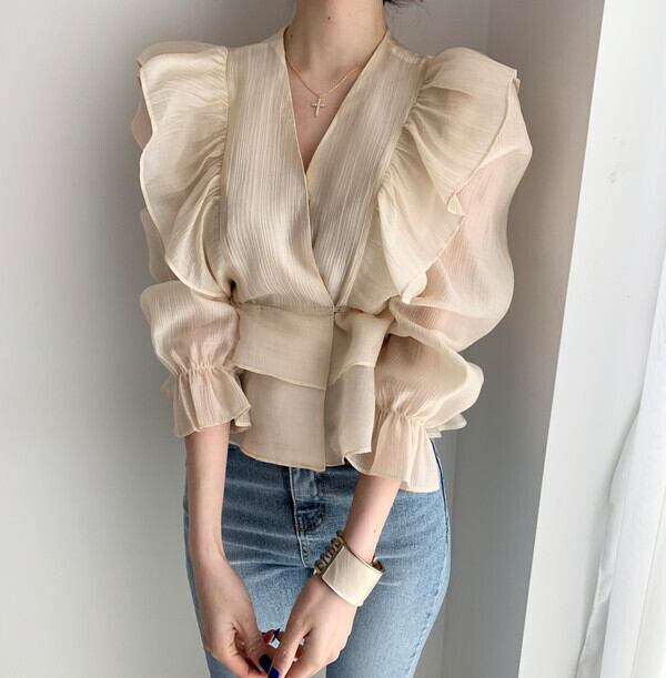 カシュクールネックと大きなフリルデザインがフェミニンな印象のブラウス♪