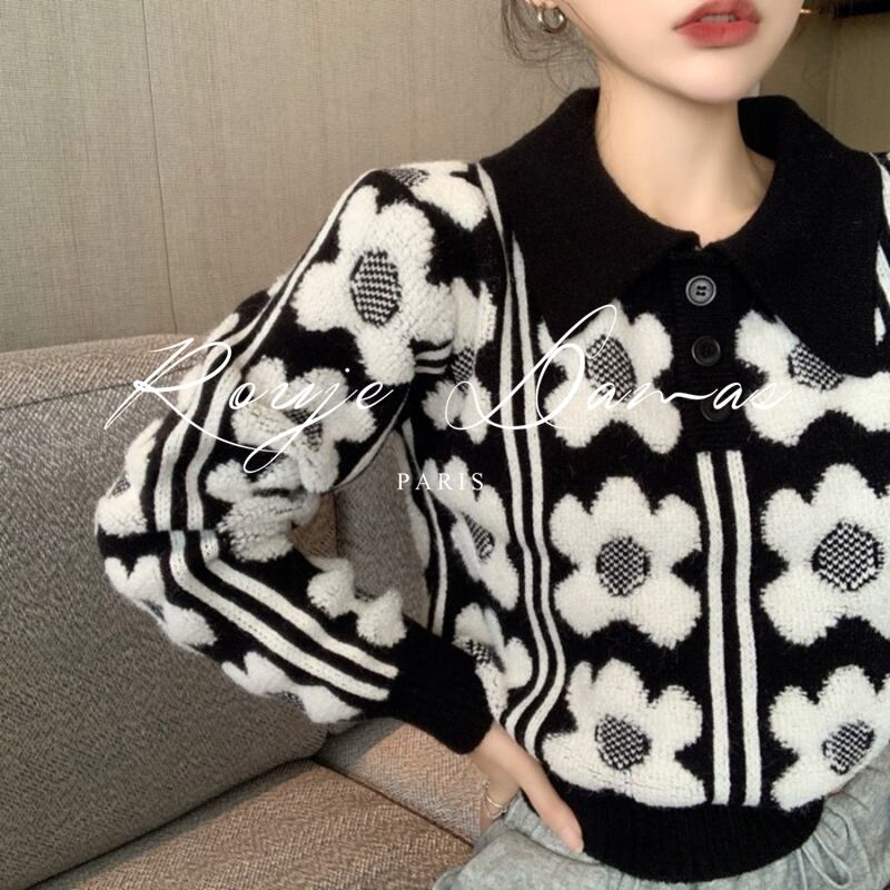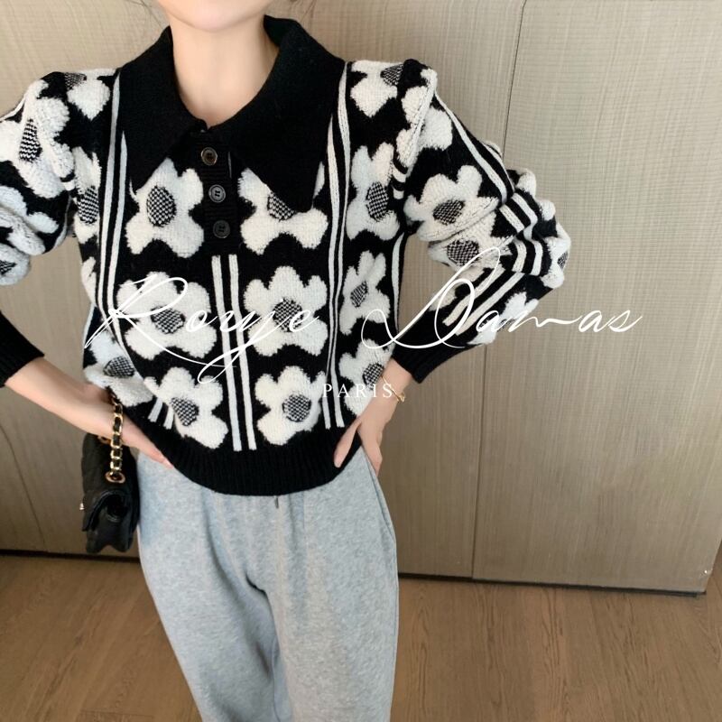 ルージュダマス トップス セーター 袖あり 長袖 襟付き もこもこ モコモコ 伸縮性 ニット かわいい カジュアル おしゃれ お洒落 レトロ 大人可愛い こなれ感 ガーリー 個性的 フラワー 秋 冬 2021 10代 20代 30代 40代 レディース 女性用 ママ デート お出かけ 女子会 休日 着回し 普段使い フリーサイズ 黒 ブラック 青 ブルー