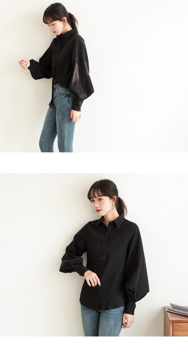 シンプルなデザインで使いやすいボリュームスリーブシャツ。