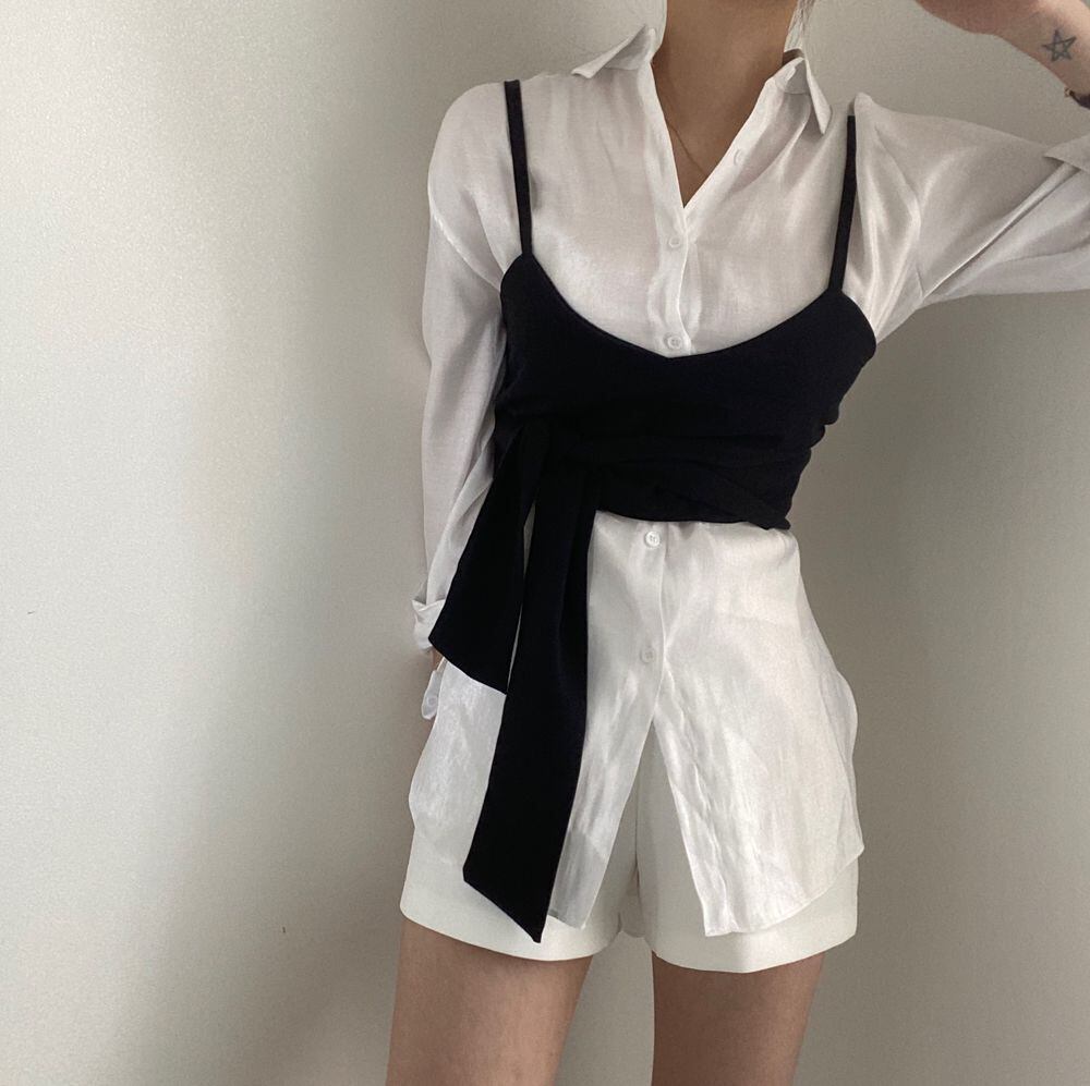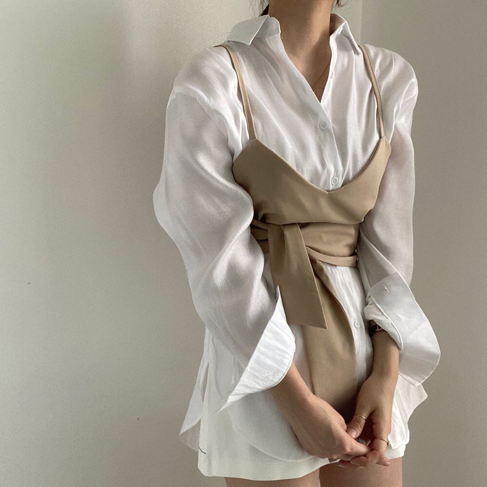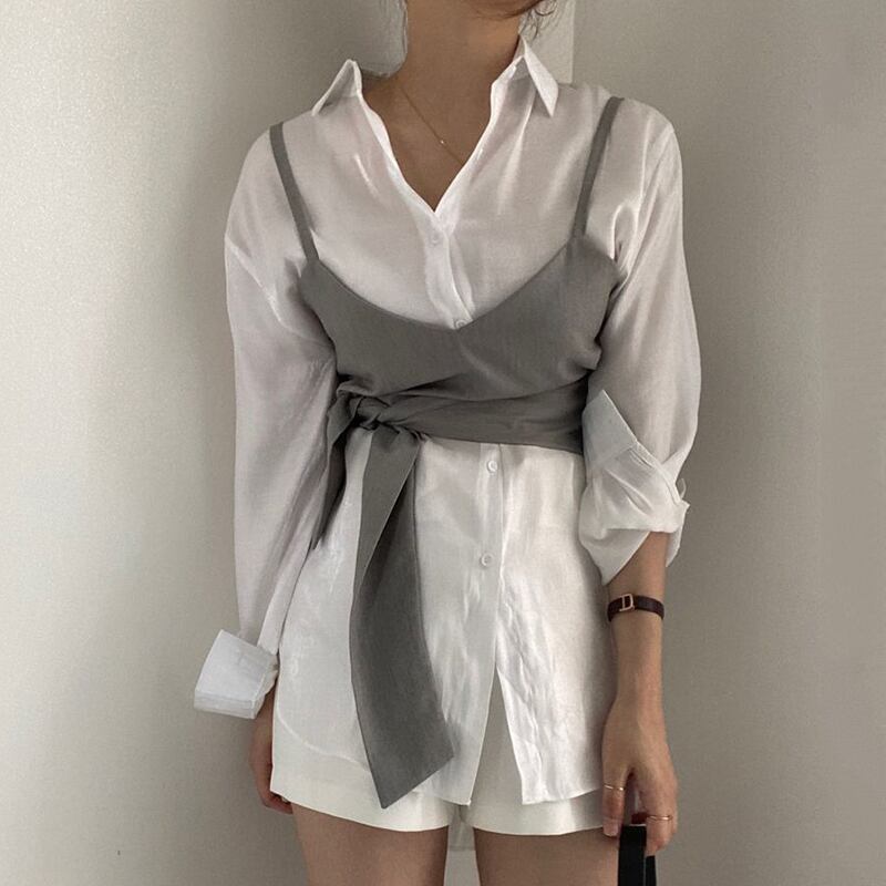 トップス シャツ ベスト 白シャツ ミディアム丈 袖あり 長袖 襟付き POLO襟 ストレート ウエストリボン 綿 2点セット 大人可愛い きれいめ シンプル おしゃれ かっこいい 大人女子 こなれ感 ガーリー ルーズ モード系 セクシー 主役級 無地 春 秋 2020 10代 20代 レディース 学生 デート お出かけ 女子会 休日 イベント 旅行 着回し 普段使い 重ね着 オルチャン ファッション モテ 美脚 脚長 定番 トレンド インスタ映え サイズ フリーサイズ 色展開 ブラック グレー カーキ