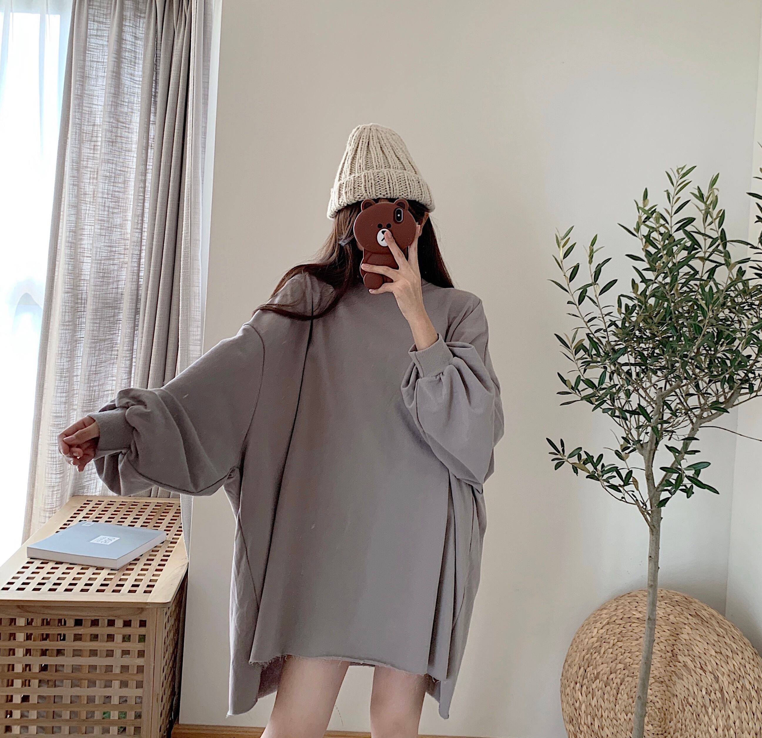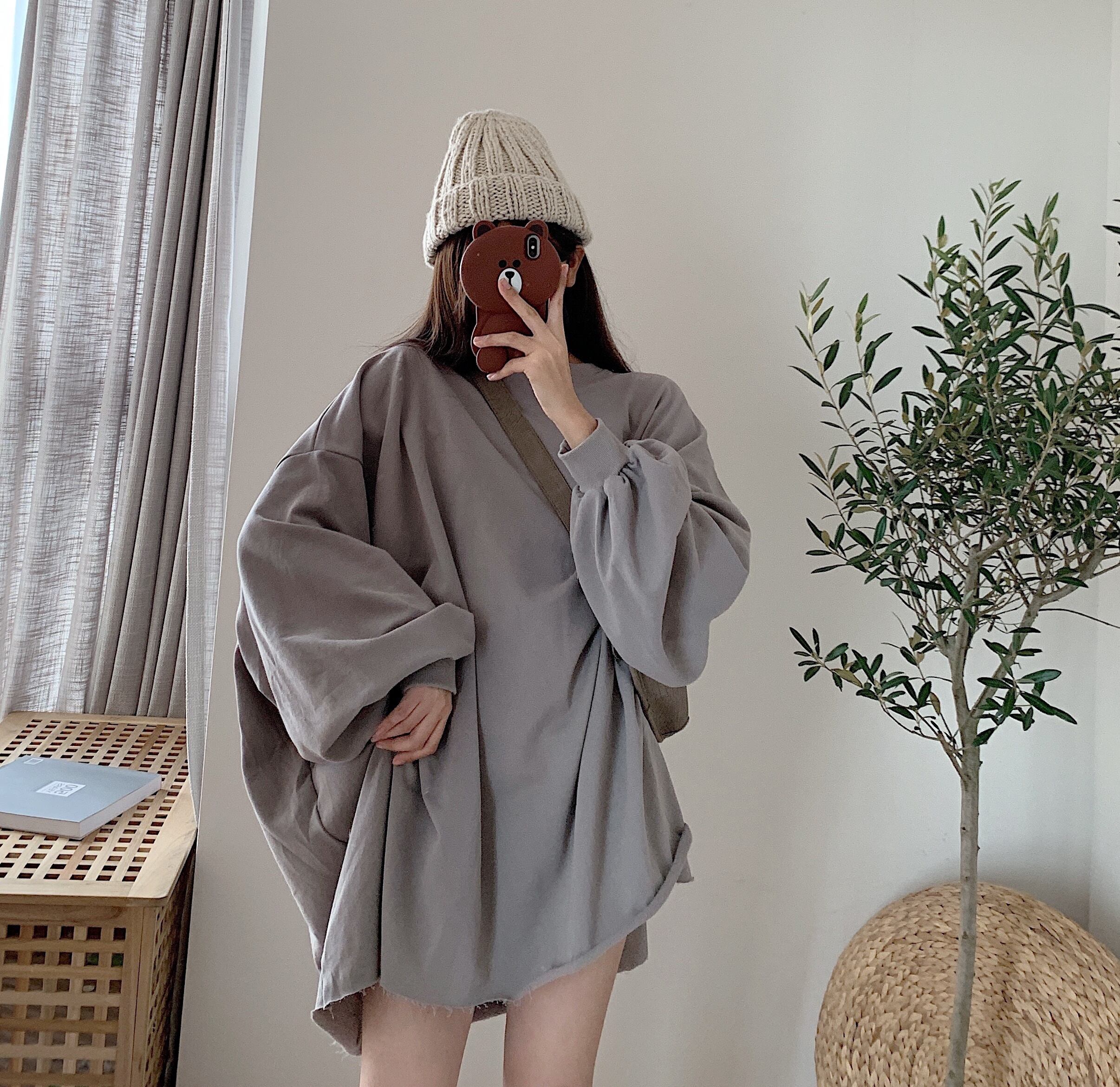 セーターウィメンズルーズレイジースタイルコリアンバージョンミドル丈インタイドオーバーサイズ トップス ワンピース Tシャツ セーター 膝上 ボリューム袖 Uネック ラウンドネック ワイド 綿 かわいい シンプル カジュアル お洒落 大人可愛い こなれ感 ラフ ルーズ 個性的 無地 春 夏 秋 10代 20代 30代 通勤 学生 通学 お出かけ 女子会 休日 普段使い ファッション 楽ちん 体系カバー ブラウン グレー くすみカラー 秋カラー