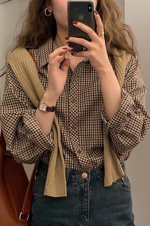 チェック柄シャツ トップス シャツ 袖あり 長袖 襟付き 前開き かわいい 大人可愛い きれいめ シンプル カジュアル 大人 上品 おしゃれ お洒落 かっこいい レトロ 大人可愛い 大人女子 こなれ感 メンズライク マニッシュ キュート 個性的 主役級 存在感 柄 チェック柄 春 秋 10代 20代 30代 レディース OL 通勤 学生 通学 デート お出かけ 公園デビュー 女子会 休日 着回し 普段使い 重ね着 サイズ S M L XL 色展開 茶色 ブラウン