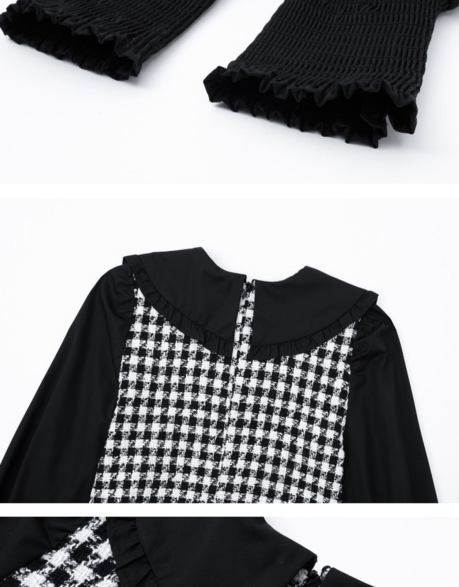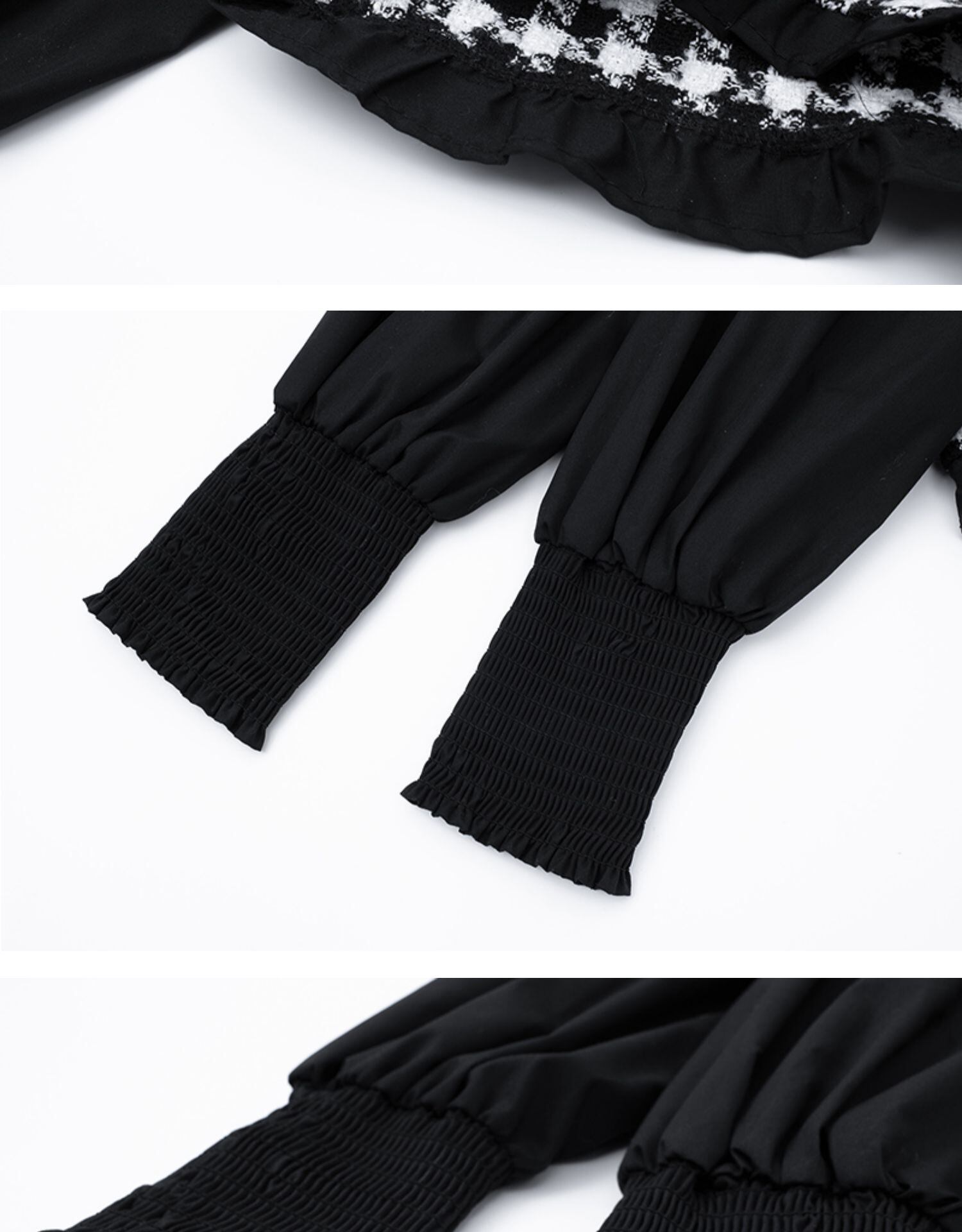 レトロな黒と白のチェック柄ツイードステッチドールネックパフスリーブシャツ トップス シャツ 長袖 パフスリーブ Uネック 襟付き ストレート 切り替えデザイン フリル 大人可愛い シンプル カジュアル 大人 お洒落 レトロ 大人女子 ラブリー ガーリー クール モード系 チェック柄 春 冬 10代 20代 レディース OL 通勤 学生 通学 お出かけ 女子会 休日 旅行 普段使い XS S M L 白 黒