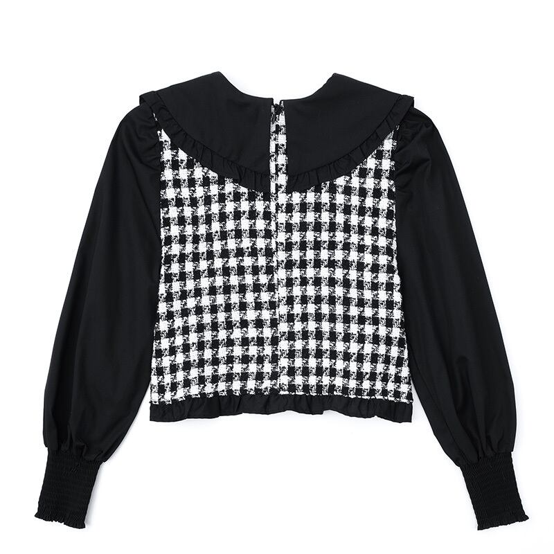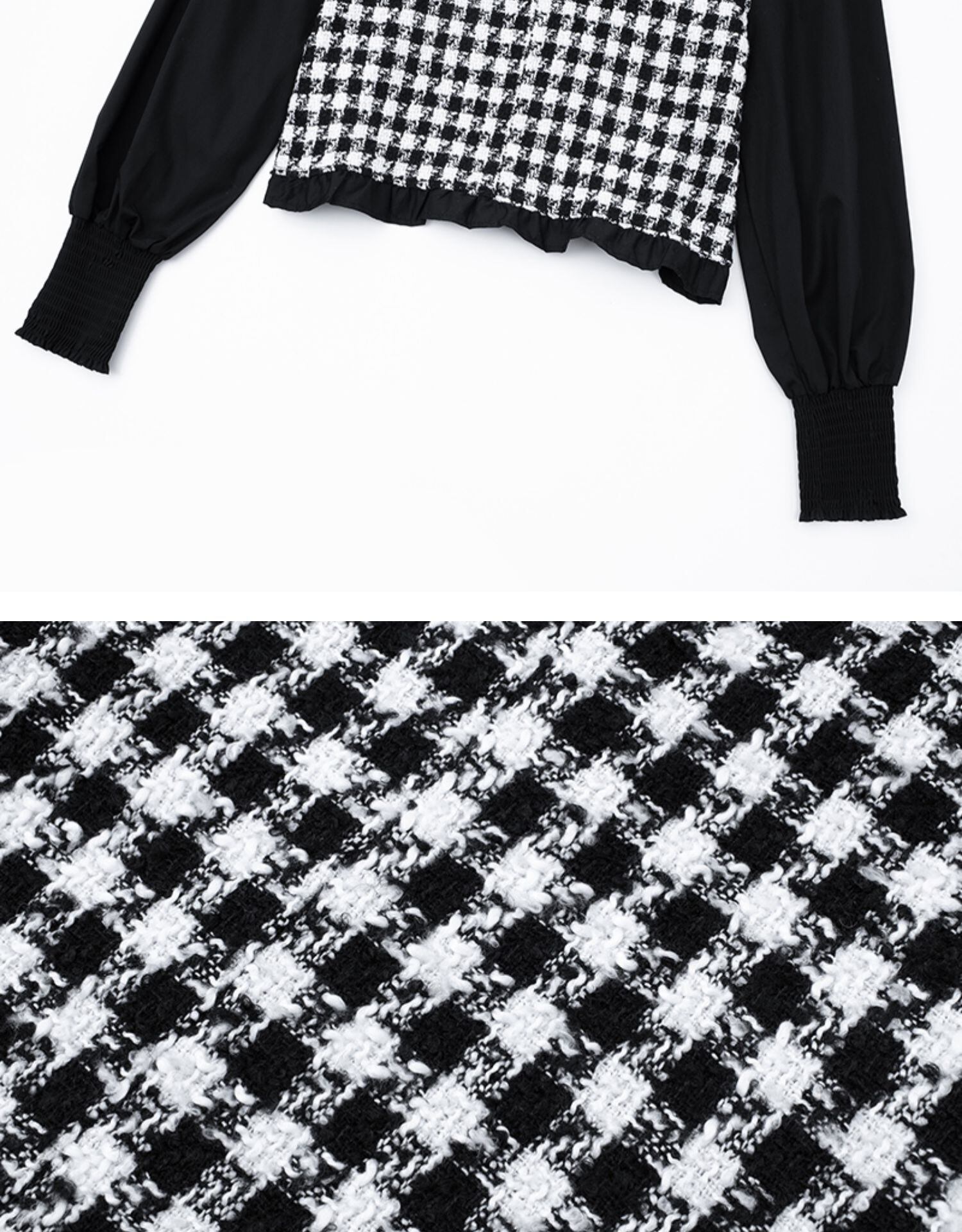 白黒チェック柄のツイードステッチのドールネックパフスリーブシャツ
