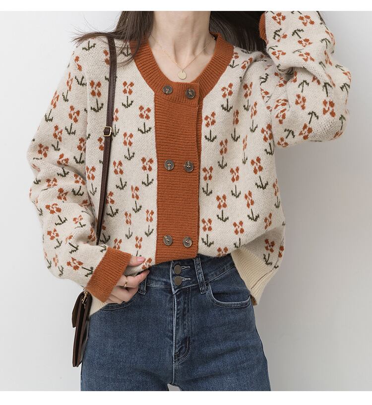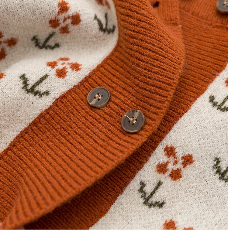 やさしい色合いに花柄が可愛いニットカーディガン。