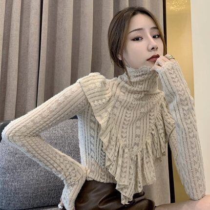 ハイネックレースフリルニット トップス ニットソー セーター 袖あり 長袖 ハイネック タートルネック スリム 細身 レース フリル かわいい 大人可愛い きれいめ シンプル カジュアル 大人 上品 おしゃれ お洒落 レトロ 大人可愛い 大人女子 こなれ感 ラフ ラブリー キュート ガーリー モダン 主役級 存在感 柄 春 秋 冬 10代 20代 30代 レディース 学生 通学 デート お出かけ 公園デビュー 女子会 休日 着回し 普段使い 重ね着 韓国系 オルチャン サイズ S M L 色展開 ホワイト