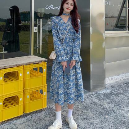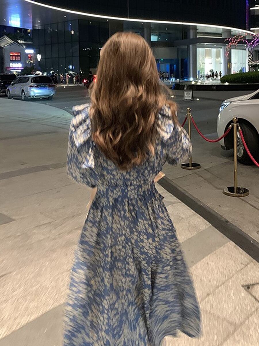 ワンピース 膝下 長袖 パフスリーブ Vネック フレア Aライン フリル リボン 伸縮性 かわいい カジュアル おしゃれ 大人女子 こなれ感 キュート ガーリー 主役級 柄 フラワー 春 秋 2022 10代 20代 30代 レディース デート お出かけ 女子会 休日 イベント 旅行 着回し 普段使い モテ 美脚 新作 トレンド インスタ映え フレンチスタイル サイズ M L XL 2XL 3XL 4XL 色展開 ブルー