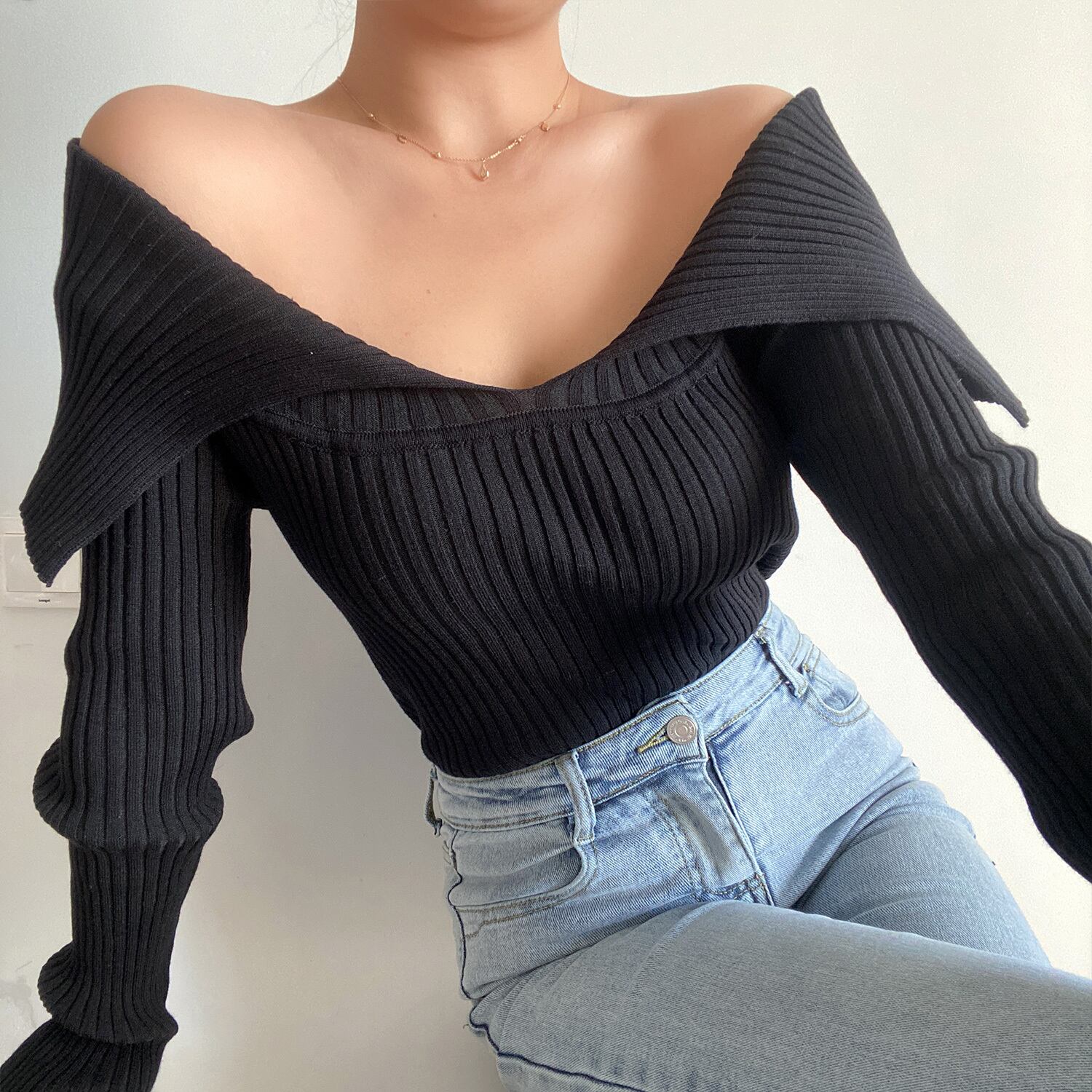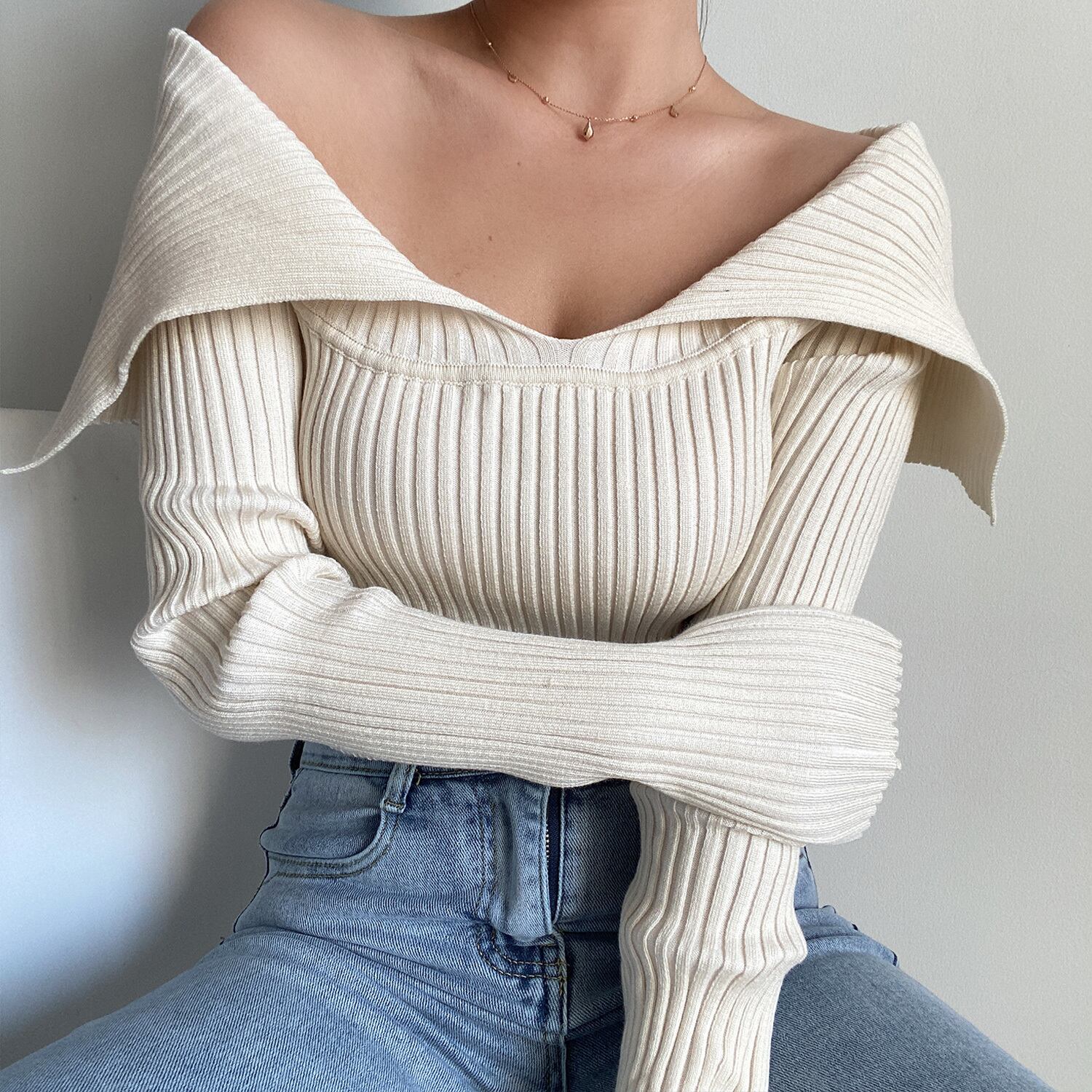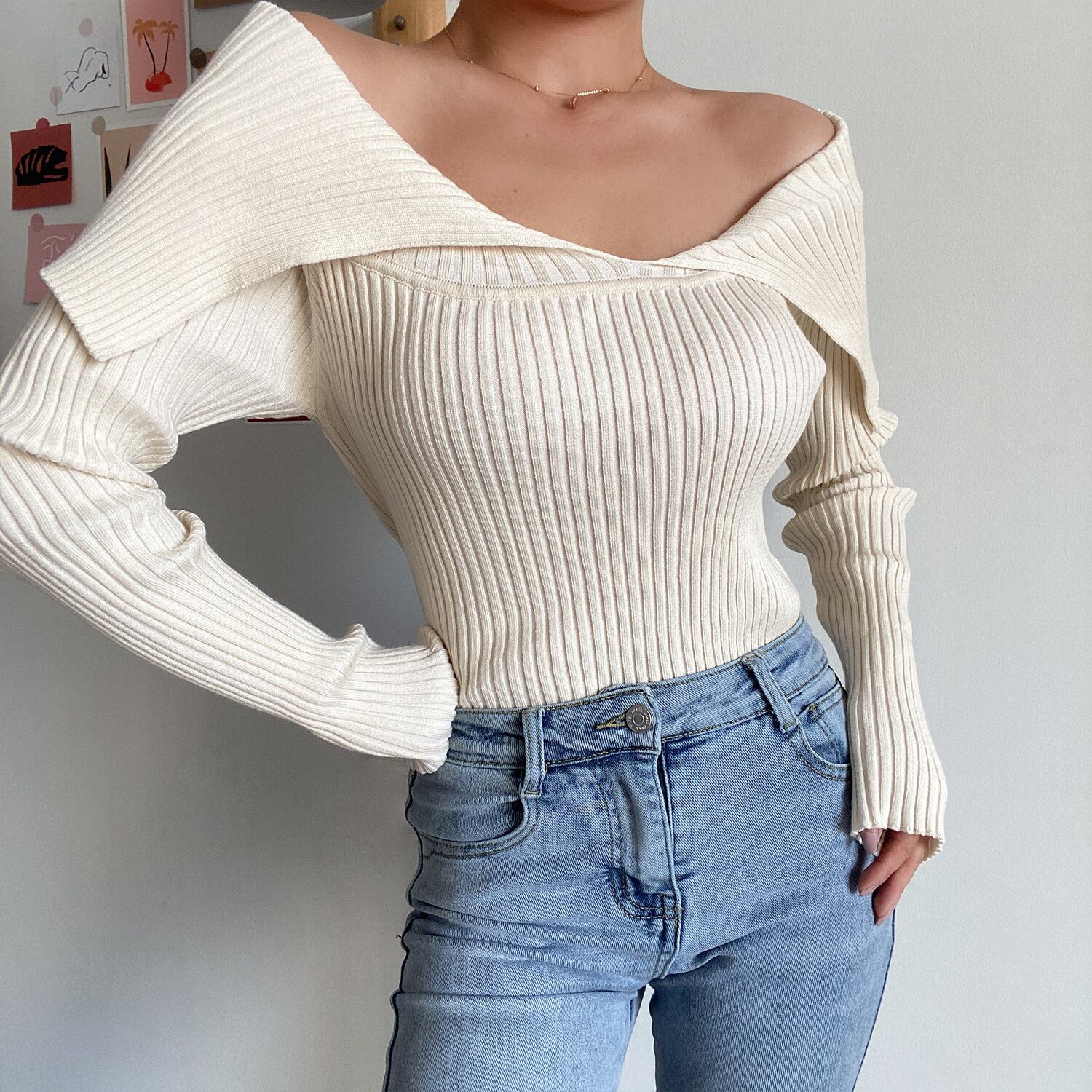 トップス ニットソー セーター 袖あり 長袖 Vネック オフショル 襟付き ストレート リブニット 伸縮性 ニット シンプル カジュアル おしゃれ お洒落 大人女子 こなれ感 セクシー 存在感 無地 春 秋 2021 10代 20代 30代 40代 レディース 女性用 デート お出かけ 女子会 休日 着回し 普段使い モテ S M L 黒 ブラック ベージュ