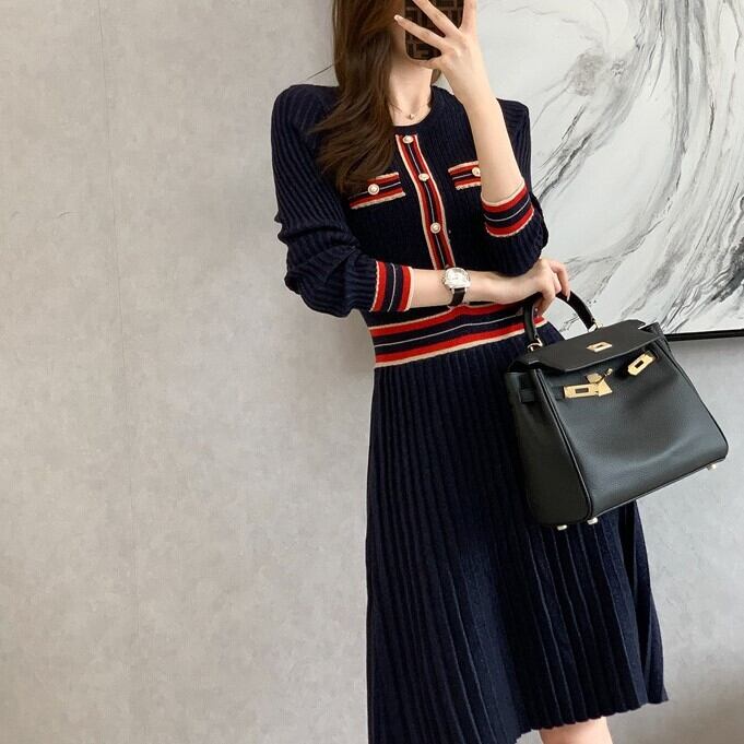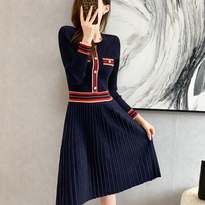 ワンピース ニットワンピ 膝丈 袖あり 長袖 ラウンドネック Aライン プリーツ ウエストマーク ブロケード ナイロン 大人可愛い きれいめ カジュアル おしゃれ レトロ 大人女子 こなれ感 ガーリー 存在感 ライン 春 秋 2022 20代 30代 デート お出かけ 女子会 休日 イベント ホテル レストラン 着回し 普段使い 韓国系 ファッション モテ 美脚 新作 トレンド インスタ映え サイズ S M L XL 色展開 ロイヤルブルー
