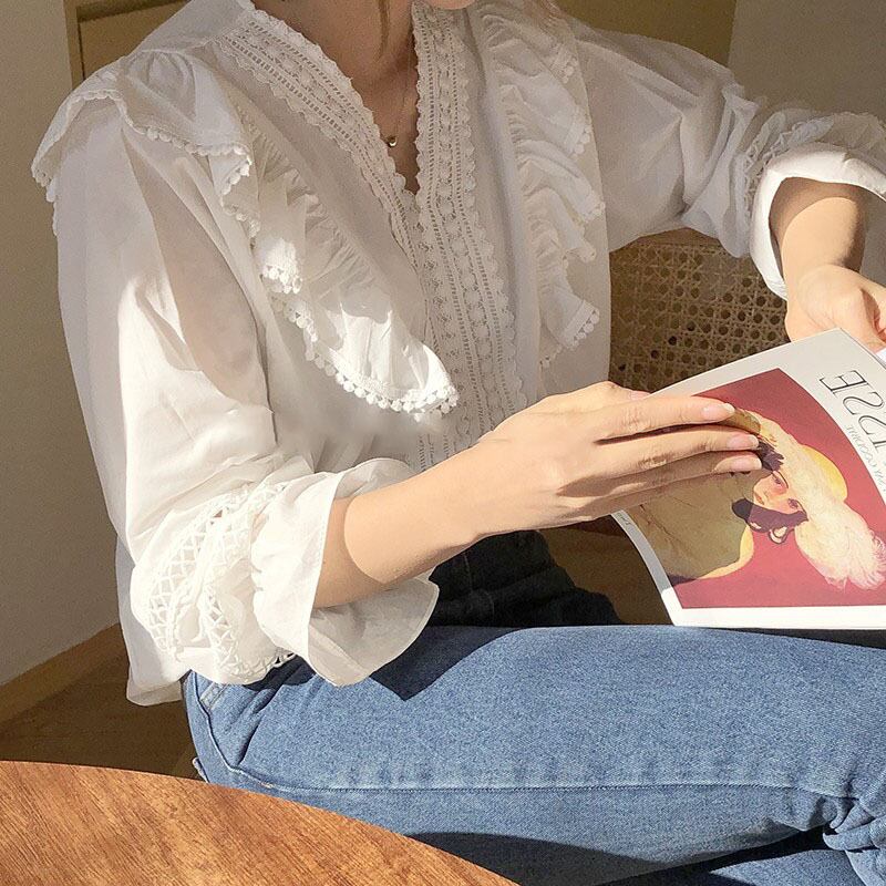 フリルシャツ トップス シャツ ブラウス 白シャツ 袖あり 長袖 Vネック フレア フリル かわいい カジュアル おしゃれ お洒落 こなれ感 ラフ キュート ガーリー 無地 春 夏 10代 20代 30代 オフィス ビジネス OL 通勤 学生 通学 デート お出かけ 着回し 韓国 韓国系 ファッション コーデ S M L XL 白 ホワイト
