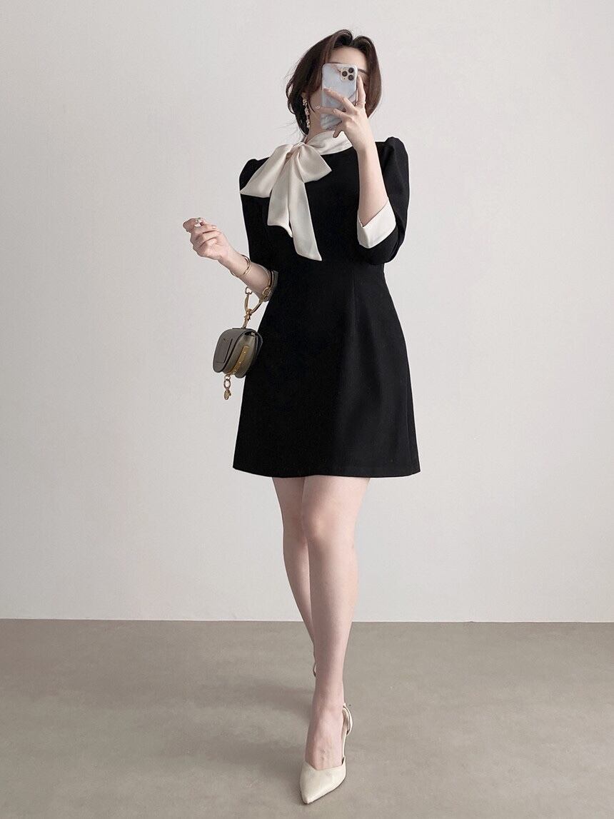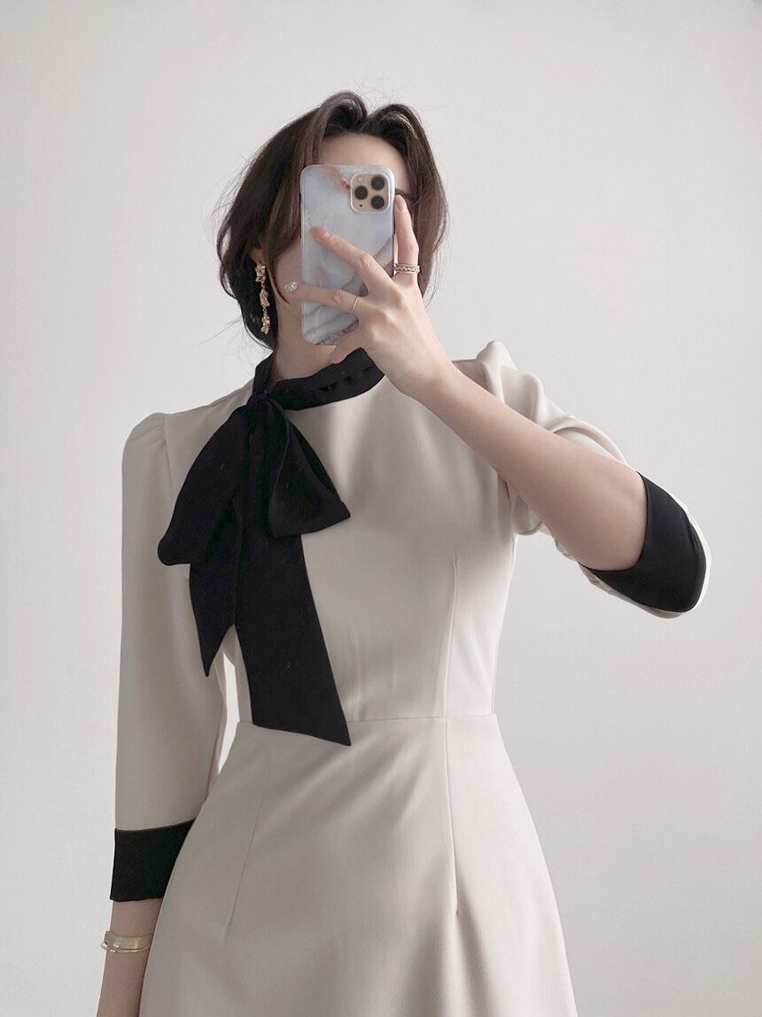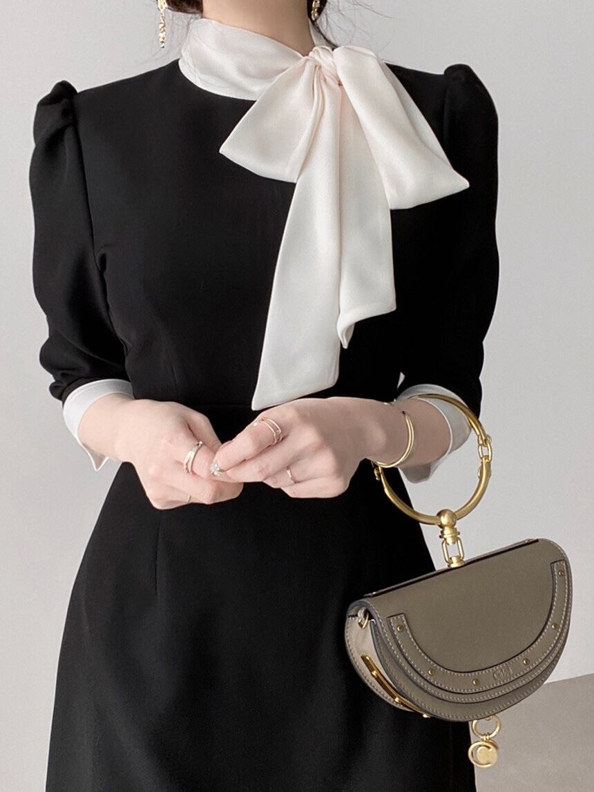 首元の大きなリボンがアクセントのバイカラーワンピース。