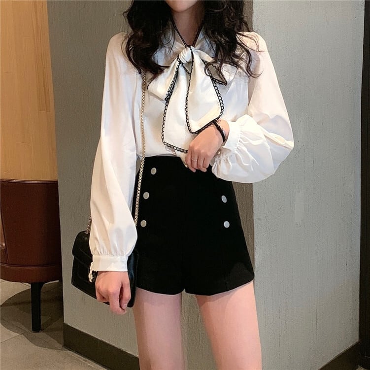 ビッグリボン トップス シャツ ブラウス 白トップス 袖あり 長袖 襟なし シフォン リボン かわいい おしゃれ お洒落 大人可愛い ラブリー キュート ガーリー 存在感 無地 春 夏 秋 10代 20代 30代 レディース 女性用 オフィス OL 通勤 学生 通学 デート 重ね着 韓国 韓国系 オルチャン S M L XL 白 ホワイト 黒 ブラック 赤 レッド