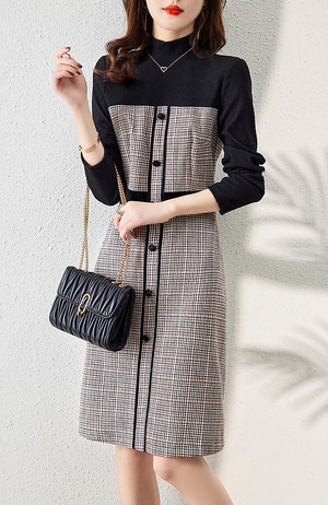ワンピース ワンピドレス 膝丈 袖あり 長袖 ハーフオープン スリム Aライン ウエストマーク 切り替えデザイン ニット 大人可愛い きれいめ 上品 おしゃれ レトロ 大人女子 キュート クール モード系 エレガント モダン 主役級 柄 チェック柄 秋 冬 2022 20代 30代 40代 レディース ママ OL 通勤 デート 女子会 休日 パーティー イベント ホテル レストラン 着回し 普段使い 韓国系 ファッション モテ 美脚 新作 トレンド インスタ映え サイズ S M L XL