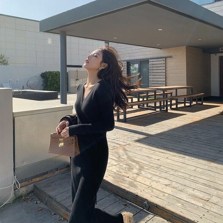 ワンピース ニットスカート ミモレ丈 袖あり 長袖 Vネック スリム リボン リブニット ニット きれいめ シンプル 上品 おしゃれ 大人女子 こなれ感 キュート セクシー エレガント とろみ感 無地 春 秋 2021 20代 30代 40代 レディース デート お出かけ 女子会 休日 イベント 着回し 普段使い 韓国系 ファッション モテ 美脚 新作 トレンド インスタ映え サイズ S M L 色展開 カラバリ