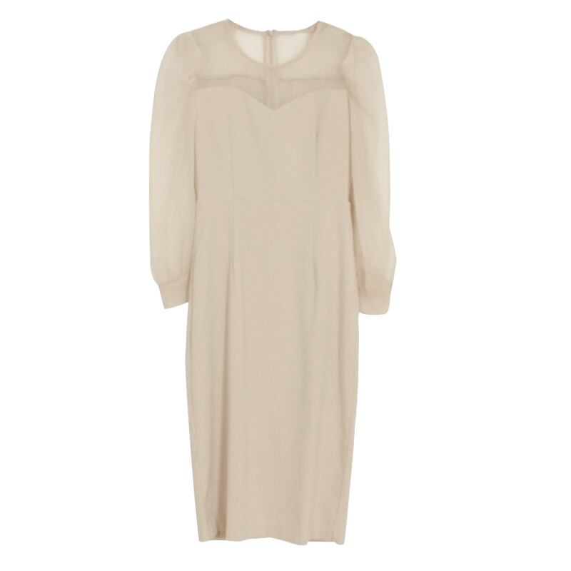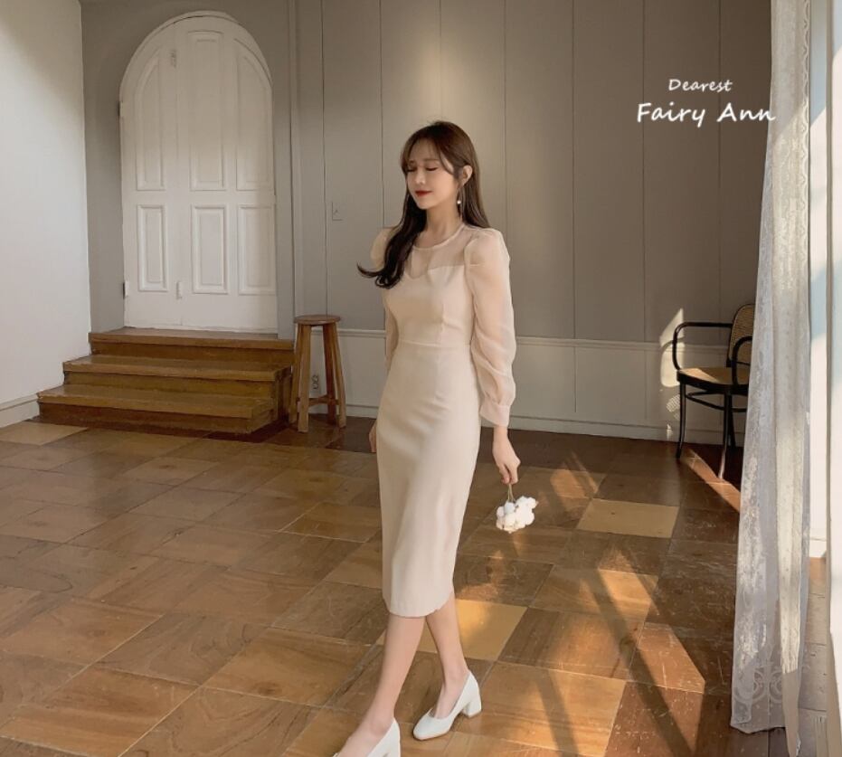ワンピース ワンピドレス ミディアム丈 袖あり 長袖 袖コンシャス ラウンドネック スリム タイト 細身 ドッキング シフォン ウエストマーク バックスリット ファスナー ハイウエスト 透け感 きれいめ シンプル 大人 上品 エレガント フォーマル 無地 春 2021 20代 30代 40代 レディース 女性用 ママ OL 通勤 デート お出かけ 休日 パーティー ホテル 普段使い 重ね着 S M L XL ベージュ