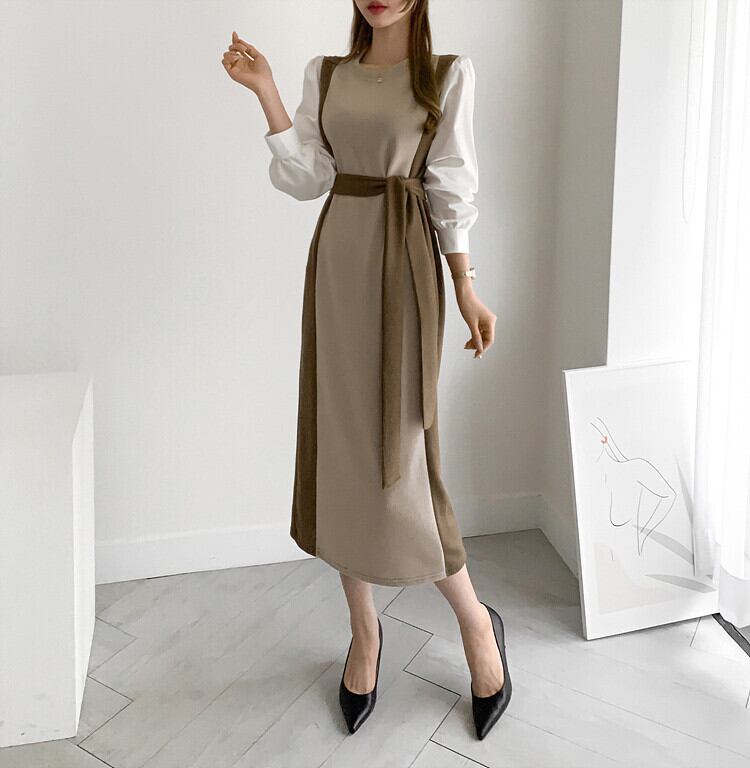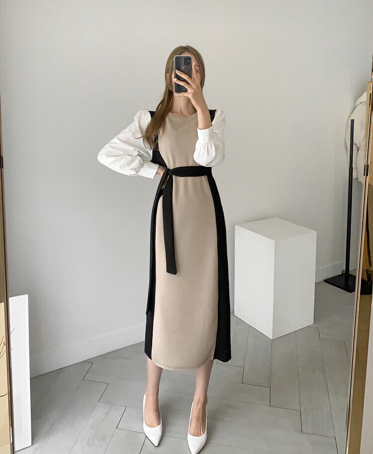 パフスリーブワンピース ワンピース シャツ タイトスカート ニットスカート ロング ロング丈 袖あり 長袖 ボリューム袖 パフスリーブ ラウンドネック スリム タイト 細身 ストレート ウエストマーク 切り替えデザイン リブ 異素材MIX 大人可愛い きれいめ 大人 上品 おしゃれ お洒落 大人可愛い 大人女子 こなれ感 無地 秋 冬 10代 20代 30代 40代 レディース 女性用 オフィス OL 通勤 学生 通学 デート 韓国 楽ちん フリーサイズ 白 ホワイト 黒 ブラック 茶色 ベージュ