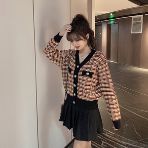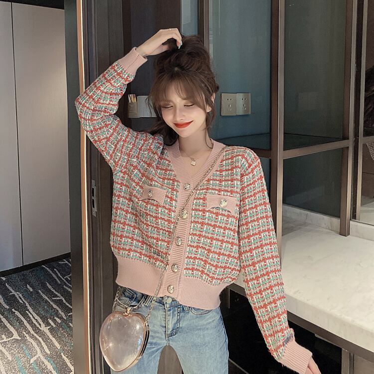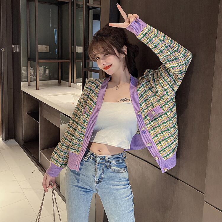 Vネックカーディガン トップス カーディガン 袖あり 長袖 Vネック 前開き かわいい カジュアル おしゃれ お洒落 レトロ ラフ ガーリー チェック柄 春 秋 10代 20代 30代 レディース 女性用 学生 通学 デート お出かけ 休日 着回し 重ね着 韓国 韓国系 S M L XL 2XL 黒 ブラック 緑 グリーン 紫 パープル ピンク
