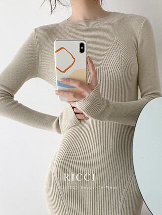 脚長縦ラインを強調するリブとタイトなシルエットでシンプルなのに女性らしさをアピールできるニットワンピース♪