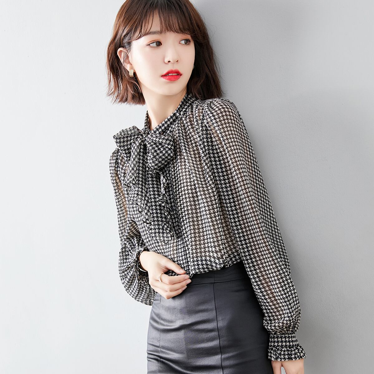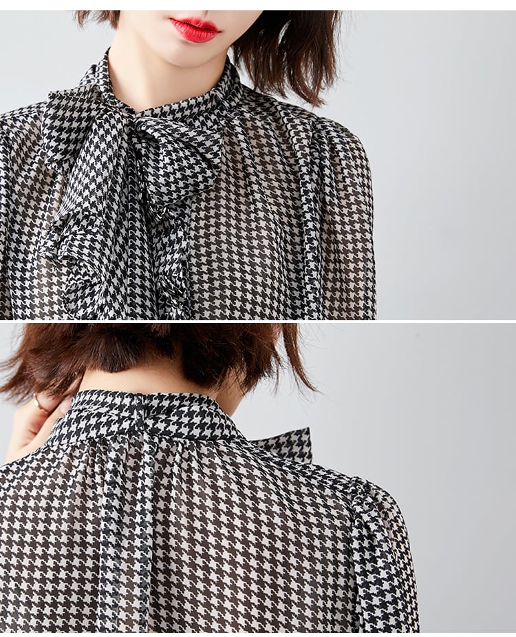アレンジ自在なボウタイリボン付きの千鳥格子柄ブラウス。