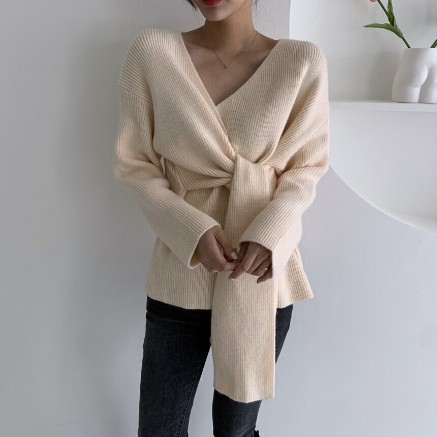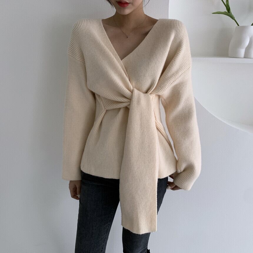 クロスVネックサイドストラップウエストデザイン長袖ニットセーターガール トップス ニットソー セーター ミディアム丈 袖あり 長袖 萌袖 Vネック ストレート きれいめ シンプル カジュアル 大人 お洒落 無地 秋 10代 20代 30代 OL 通勤 学生 通学 お出かけ 女子会 お泊まり 休日 普段使い グレー ベージュ カーキ