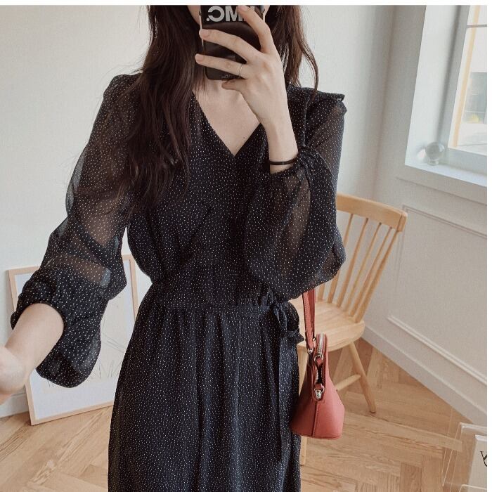 ワンピース ロング丈 長袖 パフスリーブ Vネック Aライン シフォン フリル ハイウエスト 透け感 柄 水玉 春 夏 2022 10代 20代 レディース デート お出かけ 女子会 休日 イベント リゾート 旅行 着回し 普段使い 韓国系 ファッション モテ 美脚 新作 定番 トレンド インスタ映え サイズ S M L XL 色展開 ブラック アプリコット