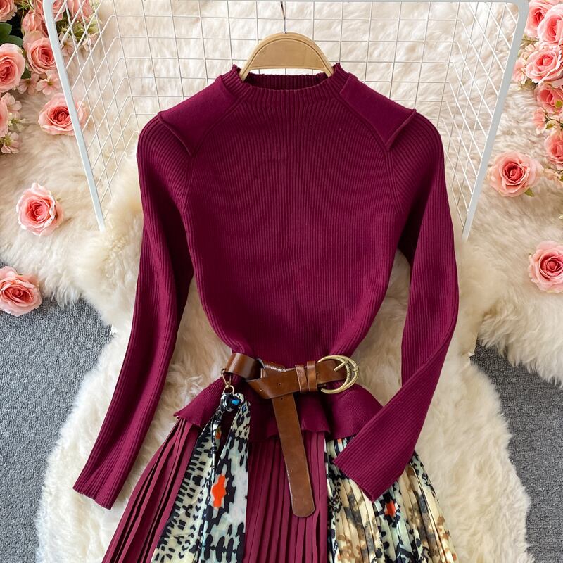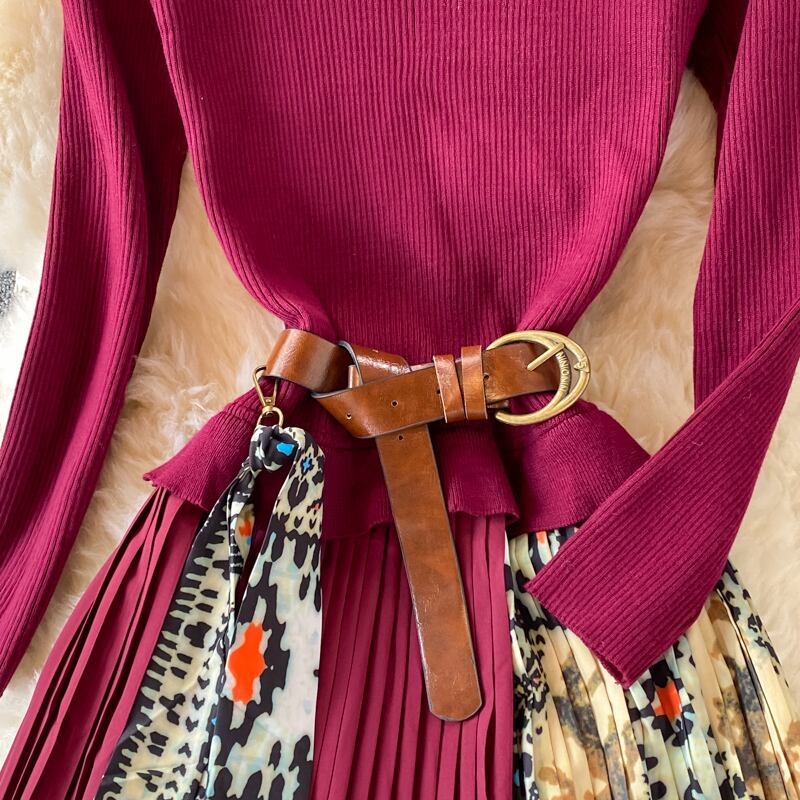 ワンピース ワンピドレス ロング丈 袖あり 長袖 スタンドカラー Aライン プリーツ ベルト ハイウエスト ニット かわいい 大人可愛い きれいめ 上品 おしゃれ レトロ 大人女子 主役級 柄 パターン 秋 冬 2021 30代 40代 50代 レディース デート お出かけ 女子会 休日 ホテル レストラン 着回し 普段使い 韓国系 ファッション モテ 新作 インスタ映え サイズ S M L XL 色展開 ブラック レッド ブルー グリーン