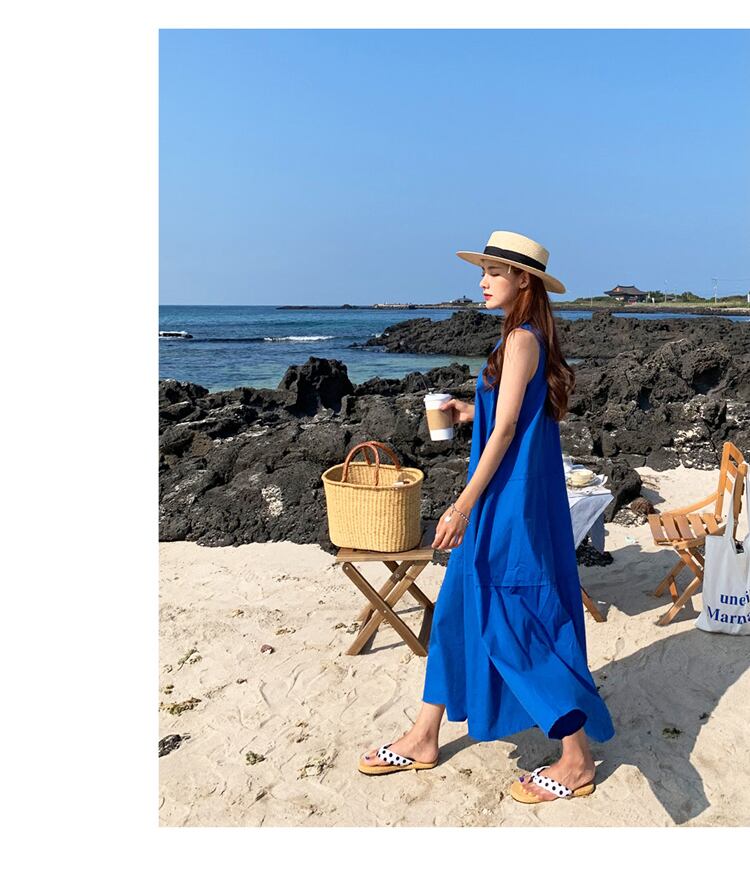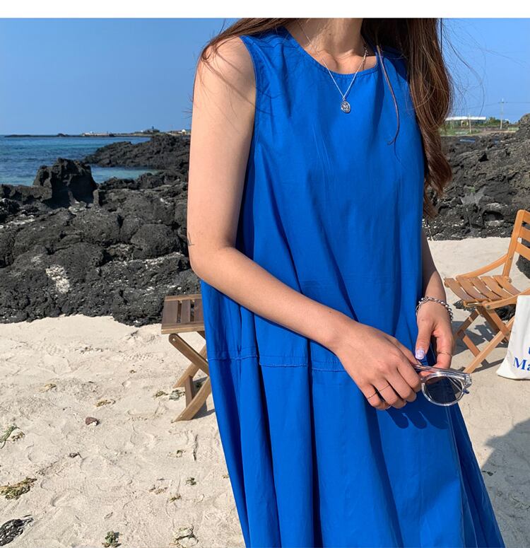ワンピース ワンピドレス ロング丈 袖なし ノースリーブ ラウンドネック ワイド Aライン 綿 シンプル おしゃれ お洒落 大人可愛い 大人女子 こなれ感 主役級 存在感 無地 夏 10代 30代 40代 レディース 女性用 ママ マタニティ 学生 デート お出かけ 女子会 休日 リゾート 旅行 海 普段使い 楽ちん S M L XL 青 ブルー