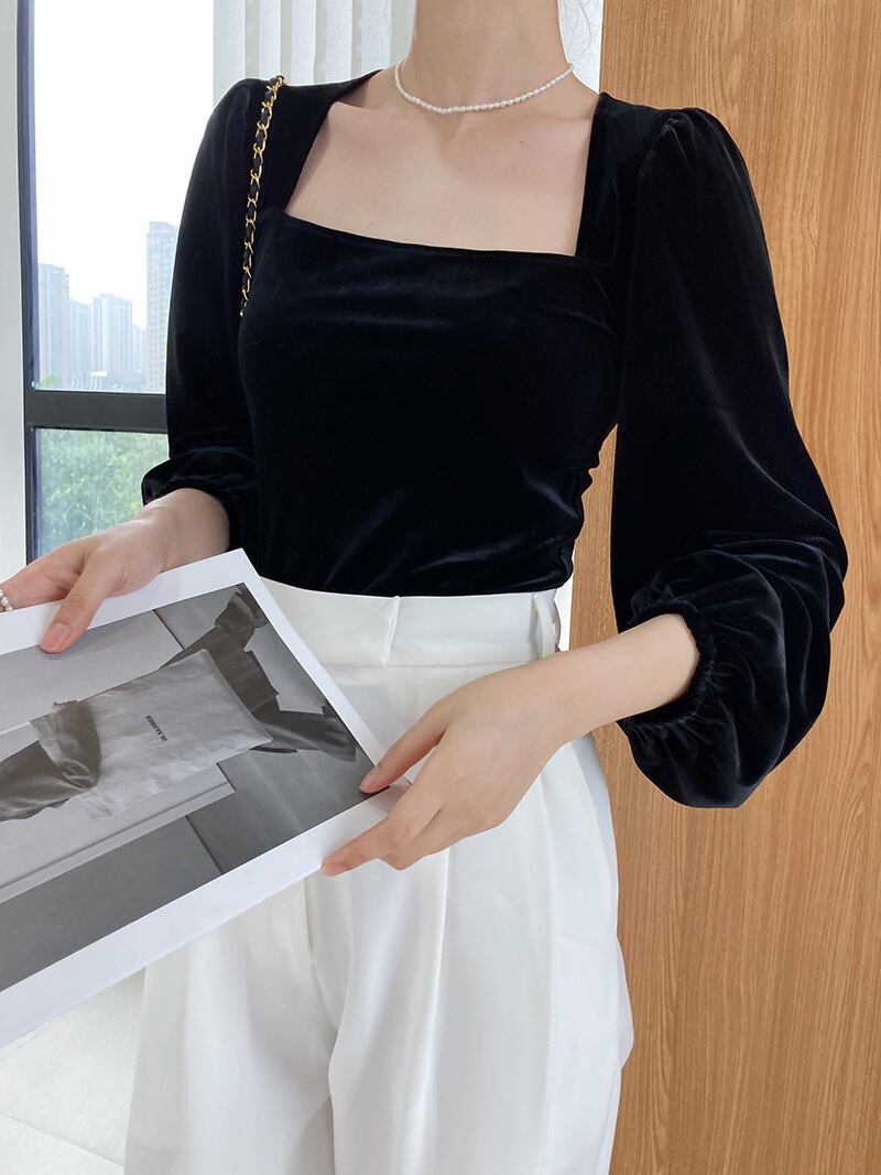 ベルベット トップス ブラウス プルオーバー 袖あり 長袖 ボリューム袖 スクエアネック 細身 コーデュロイ ベルベット 大人可愛い きれいめ シンプル 大人 上品 おしゃれ お洒落 大人女子 モード系 セクシー エレガント 無地 秋 冬 10代 20代 30代 40代 レディース 女性用 OL 学生 デート ホテル レストラン 韓国 韓国系 S M L XL 黒 ブラック