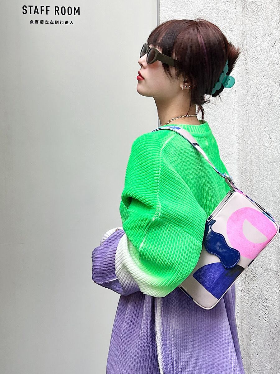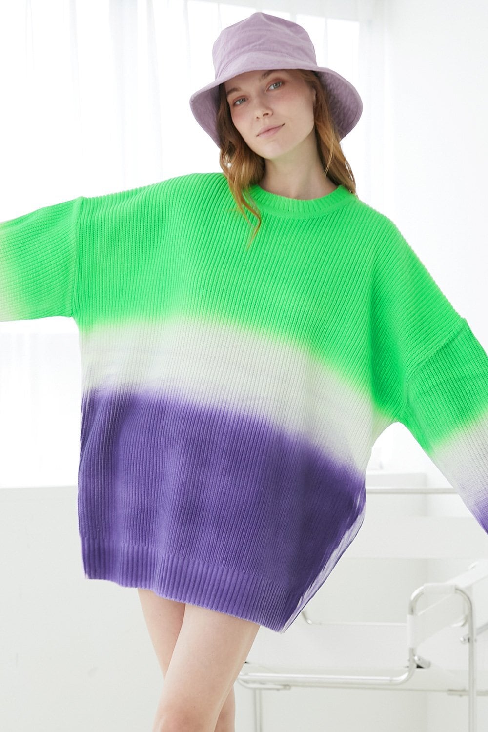 秋冬新デザイングラデーションニットシャツ緩いセーター トップス ニットソー ロング ミディアム丈 長袖 萌袖 ラウンドネック 大人可愛い カジュアル お洒落 こなれ感 ラフ ルーズ 個性的 モダン 存在感 柄 秋 冬 10代 20代 学生 通学 お出かけ 女子会 休日 パーティー イベント 旅行 着回し 楽ちん S M ゆったり ゆる ホワイト グリーン パープル