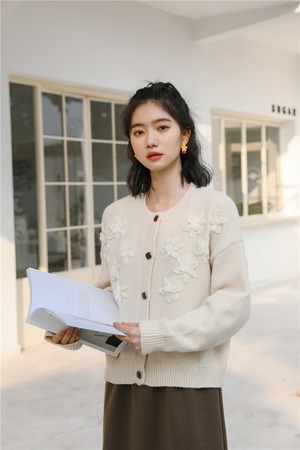 フロント部分に女の子らしいフラワー刺繍が施されたニットカーディガン♪