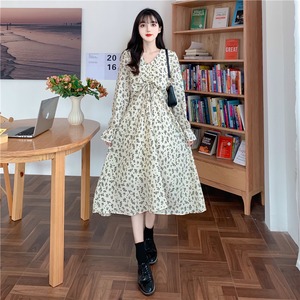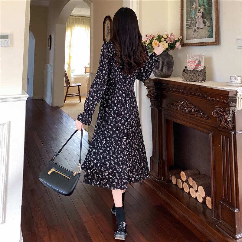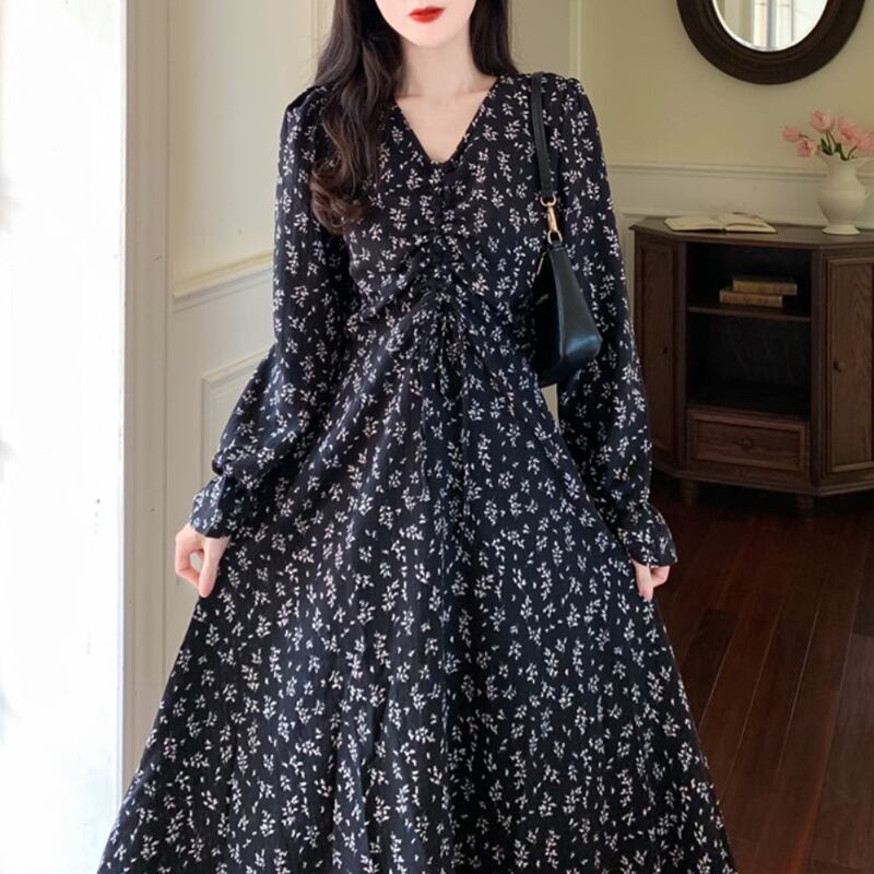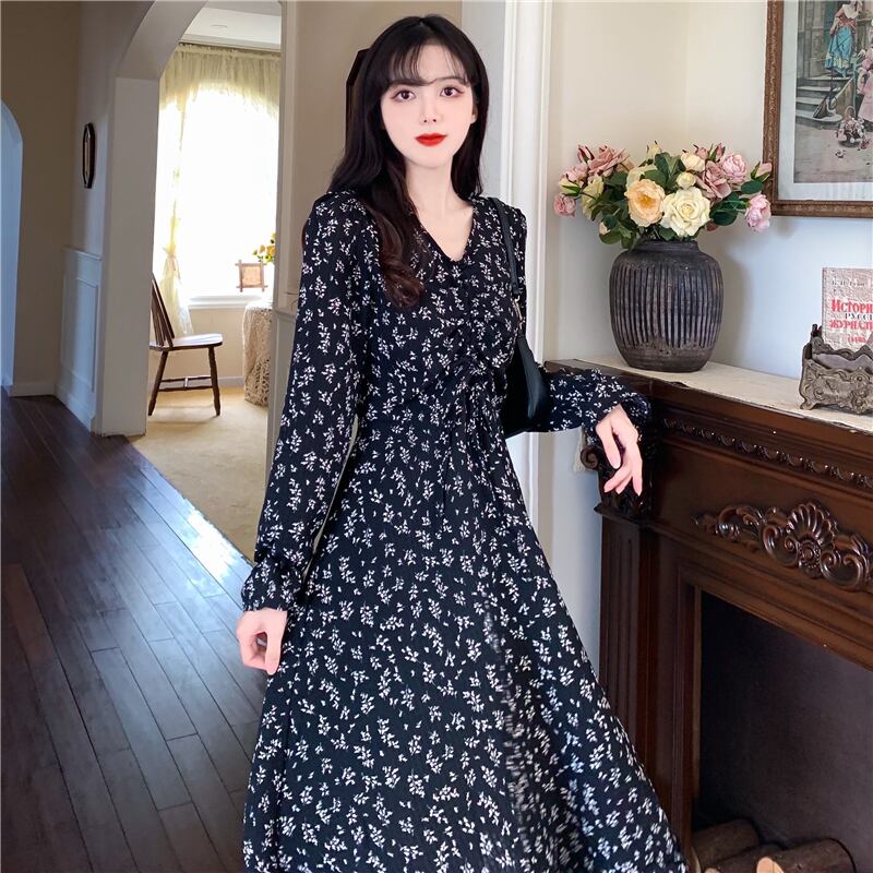 ワンピース ミモレ丈 袖あり 長袖 Vネック フレア Aライン リボン ハイウエスト かわいい 大人可愛い カジュアル おしゃれ かっこいい 大人女子 こなれ感 キュート ガーリー 主役級 柄 花柄 春 秋 2021 10代 20代 30代 レディース デート お出かけ 女子会 休日 イベント 旅行 着回し 普段使い 重ね着 韓国系 ファッション 楽ちん モテ 体系カバー 美脚 新作 定番 トレンド インスタ映え サイズ M L XL 2XL 3XL 4XL サイズ展開豊富 色展開 ブラック