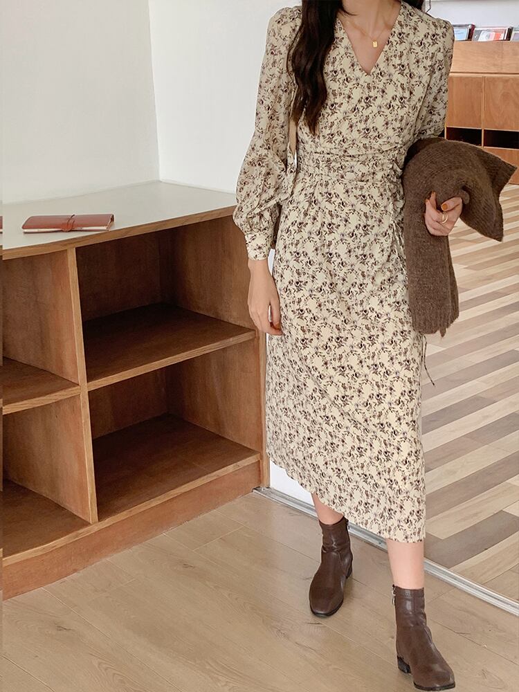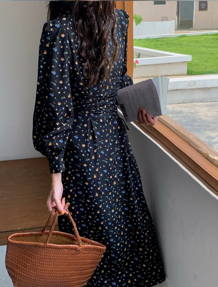 ワンピース ロング丈 袖あり 長袖 パフスリーブ Vネック Aライン シフォン ハイウエスト 大人可愛い きれいめ 上品 おしゃれ ガーリー 主役級 とろみ感 柄 小花柄 春 秋 2022 10代 20代 30代 レディース 学生 デート お出かけ 女子会 休日 イベント 旅行 着回し 普段使い 韓国系 ファッション モテ 美脚 新作 トレンド インスタ映え サイズ S M L 色展開 ブラック ミルクベージュ