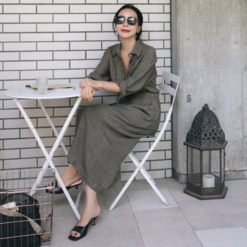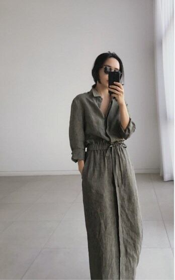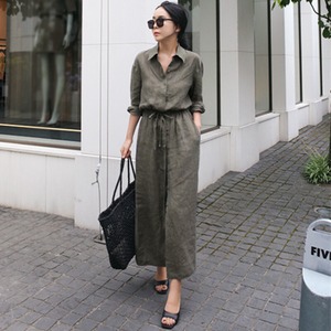 ルーズビッグサイズコットン麻ドレススカートカジュアル学生ストライプシャツ ワンピース ワンピドレス ロング ロング丈 長袖 襟付き Aライン ベルト ウエストリボン スリット 前開き 麻 大人可愛い きれいめ シンプル カジュアル 大人可愛い 大人女子 こなれ感 ガーリー セクシー 無地 春 秋 10代 20代 30代 40代 通勤 学生 通学 お出かけ 休日 旅行 普段使い S M L XL グレー