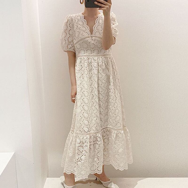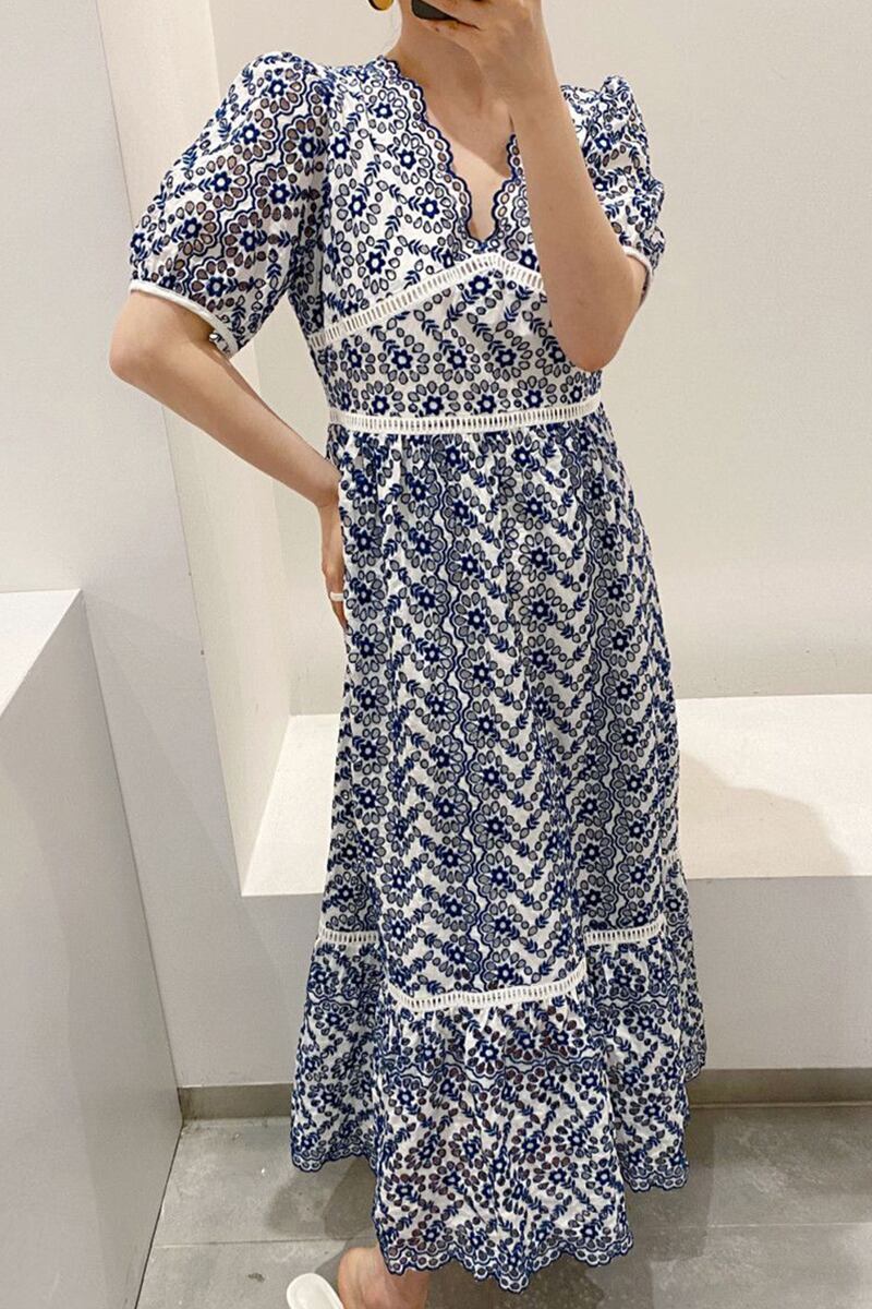 韓国チックフレンチヴィンテージVネック刺繍アイシング腰が細く、長いバブルスリーブドレス ワンピース ワンピドレス ロング丈 半袖 Vネック ストレート ハイウエスト 大人可愛い きれいめ カジュアル お洒落 レトロ アジアン エスニック 大人女子 こなれ感 ラフ 柄 春 夏 10代 20代 30代 OL 通勤 学生 通学 デート お出かけ 女子会 お泊まり 休日 旅行 高原 ガーデン 普段使い 韓国 ブルー ベージュ