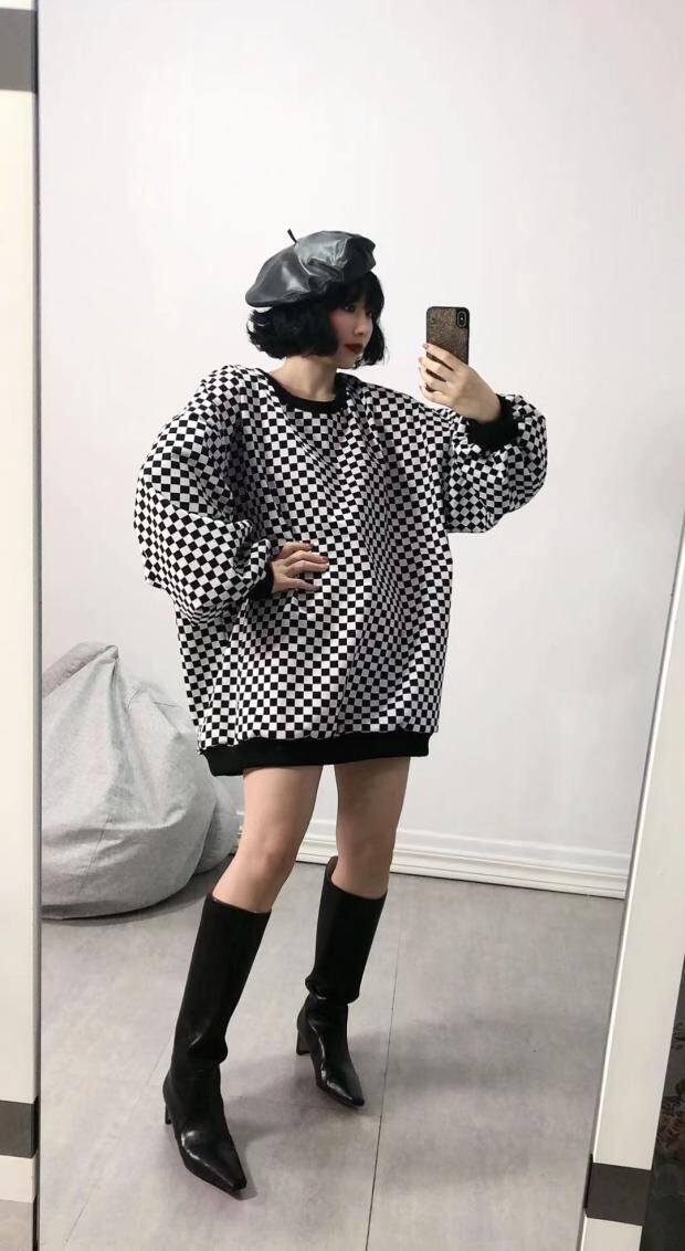 格子柄トレーナー トップス プルオーバー トレーナー スウェット 袖あり 長袖 ボリューム袖 ラウンドネック ワイド かわいい おしゃれ お洒落 ラフ メンズライク ルーズ 個性的 クール モード系 存在感 柄 格子柄 秋 冬 10代 20代 30代 レディース 女性用 マタニティ 学生 お出かけ お泊まり 休日 普段使い 韓国 韓国系 オルチャン ファッション 楽ちん フリーサイズ 白 ホワイト 黒 ブラック
