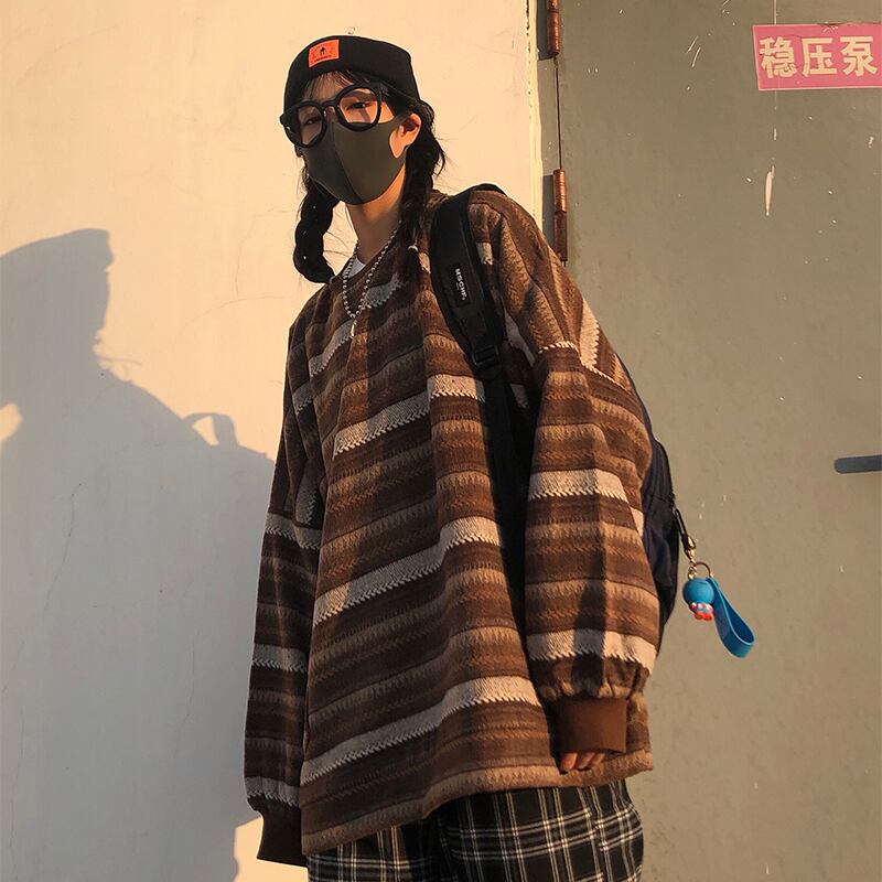 ルーズセーター トップス セーター プルオーバー 袖あり 長袖 Uネック ラウンドネック ワイド カジュアル おしゃれ お洒落 アジアン エスニック エキゾチック ラフ メンズライク マニッシュ ボーイッシュ ルーズ 柄 ボーダー 秋 冬 10代 20代 30代 学生 通学 デート お出かけ 着回し 普段使い 韓国 韓国系 ファッション S M L XL 大きめ ビッグサイズ 黒 ブラック 茶色 ブラウン 灰色 グレー