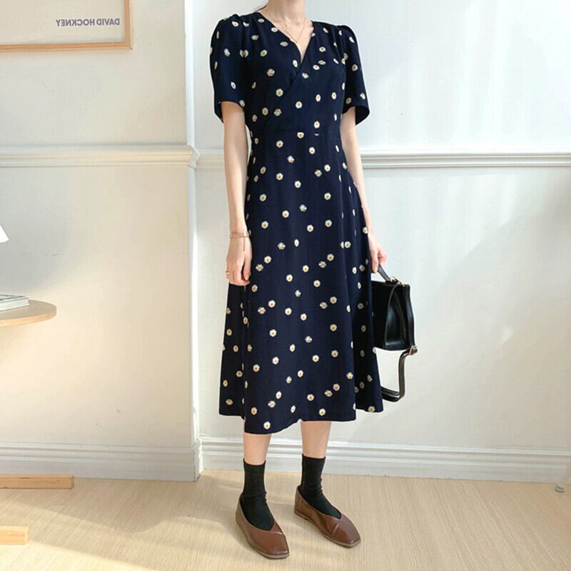 デイジー柄ワンピース フレアワンピース ワンピドレス ミモレ ミモレ丈 ロング ロング丈 袖あり 半袖 パフスリーブ Vネック ハイウエスト かわいい 大人可愛い きれいめ シンプル カジュアル 大人 上品 おしゃれ お洒落 かっこいい レトロ 大人可愛い 大人女子 こなれ感 ラフ ラブリー キュート ガーリー モダン 主役級 存在感 柄 花柄 春 夏 10代 20代 30代 レディース 学生 通学 デート お出かけ 女子会 休日 着回し 普段使い 重ね着 サイズ M L XL 2XL 3XL 4XL