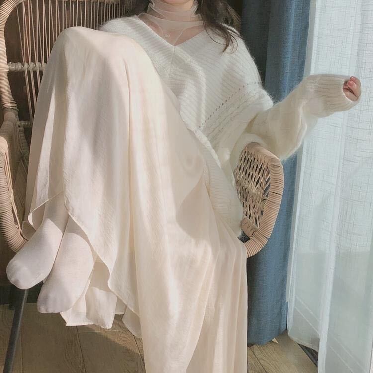 トップス スカート ボトムス セーター ロングスカート ロング丈 袖あり 長袖 ドロップショルダー Vネック Aライン シフォン ハイウエスト ウエストゴム 伸縮性 上下セット 2点セット ツーピース かわいい おしゃれ お洒落 キュート 無地 秋 冬 10代 20代 30代 40代 レディース ママ マタニティ デート お出かけ 休日 着回し 普段使い 楽ちん モテ 体系カバー S M L XL 白 ホワイト