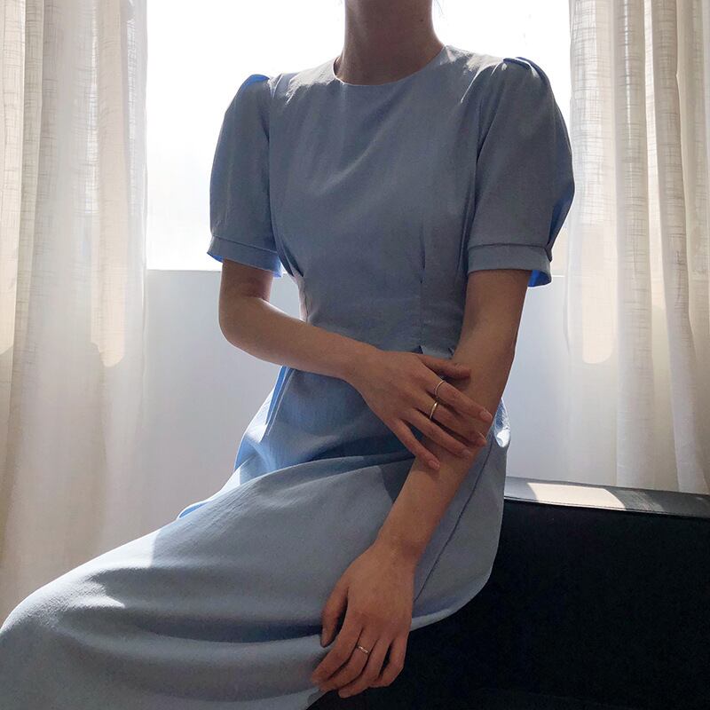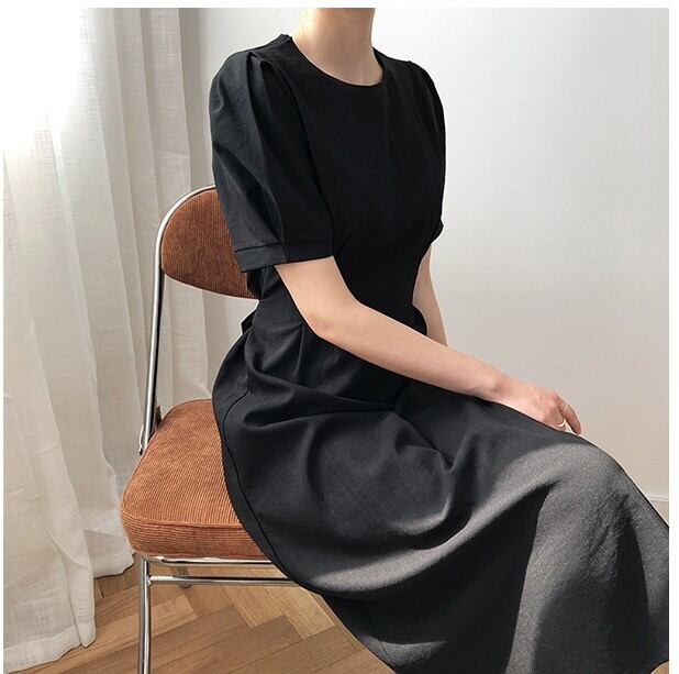 バブルスリーブウエストドレスレディース夏2021新しいフレンチリトルブラックドレスエレガント ワンピース ワンピドレス ミモレ丈 ロング 半袖 ラウンドネック Aライン リボン ウエストリボン ハイウエスト 大人可愛い きれいめ シンプル カジュアル 大人女子 こなれ感 ガーリー 無地 夏 秋 10代 20代 OL 通勤 学生 通学 デート お出かけ 女子会 お泊まり 休日 イベント リゾート 旅行 高原 ガーデン 普段使い M L