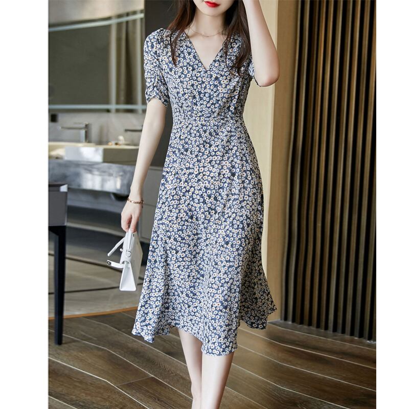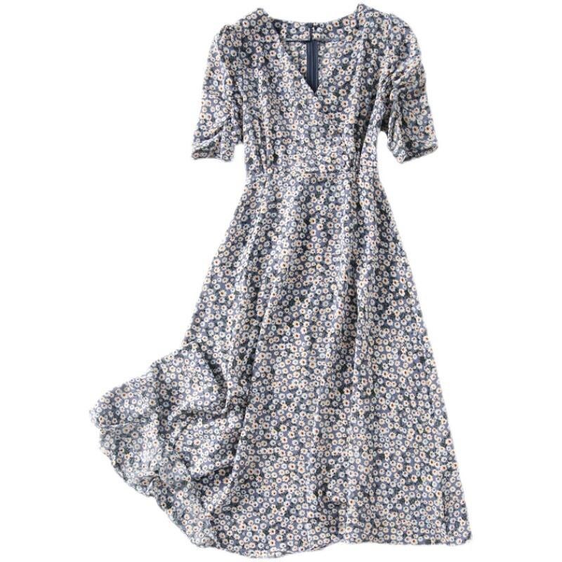 花柄ワンピース フレアワンピース 膝丈 ひざ丈 袖あり 半袖 パフスリーブ Vネック フレア シフォン ハイウエスト かわいい 大人可愛い きれいめ シンプル カジュアル 大人 上品 おしゃれ お洒落 かっこいい 大人可愛い 大人女子 こなれ感 ラブリー キュート ガーリー 個性的 主役級 存在感 柄 花柄 小花柄 春 夏 10代 20代 30代 レディース 学生 通学 デート お出かけ 女子会 休日 着回し 普段使い 重ね着 韓国系 オルチャン サイズ S M L XL 2XL 色展開 ブルー