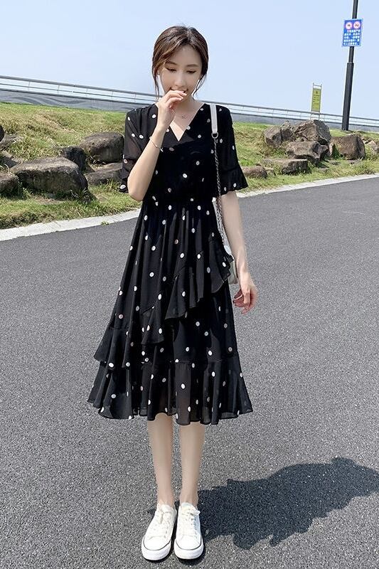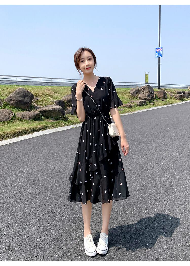 ドット柄ワンピース フレアワンピース 膝丈 ひざ丈 袖あり 半袖 Vネック フレア シフォン フリル ハイウエスト かわいい 大人可愛い きれいめ シンプル カジュアル 大人 上品 おしゃれ お洒落 かっこいい 大人可愛い 大人女子 こなれ感 ラブリー キュート ガーリー エレガント モダン 主役級 存在感 柄 ドット柄 水玉 春 夏 10代 20代 30代 レディース 学生 通学 デート お出かけ 女子会 休日 着回し 普段使い 重ね着 サイズ S M L XL 2XL 3XL 色展開 ブラック