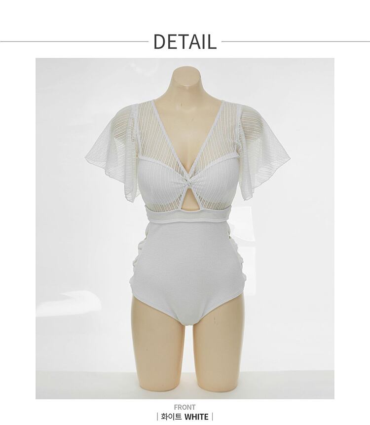 フリルスリーブサイドスリット水着はパンツサイドにリボンの様なスリットが入っているのが印象的な水着です。また、フリルスリーブの羽織はストライプ柄のシースルーで全体的にきれいめセクシーなイメージの水着になっています。