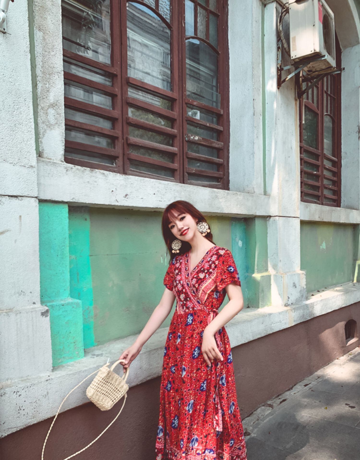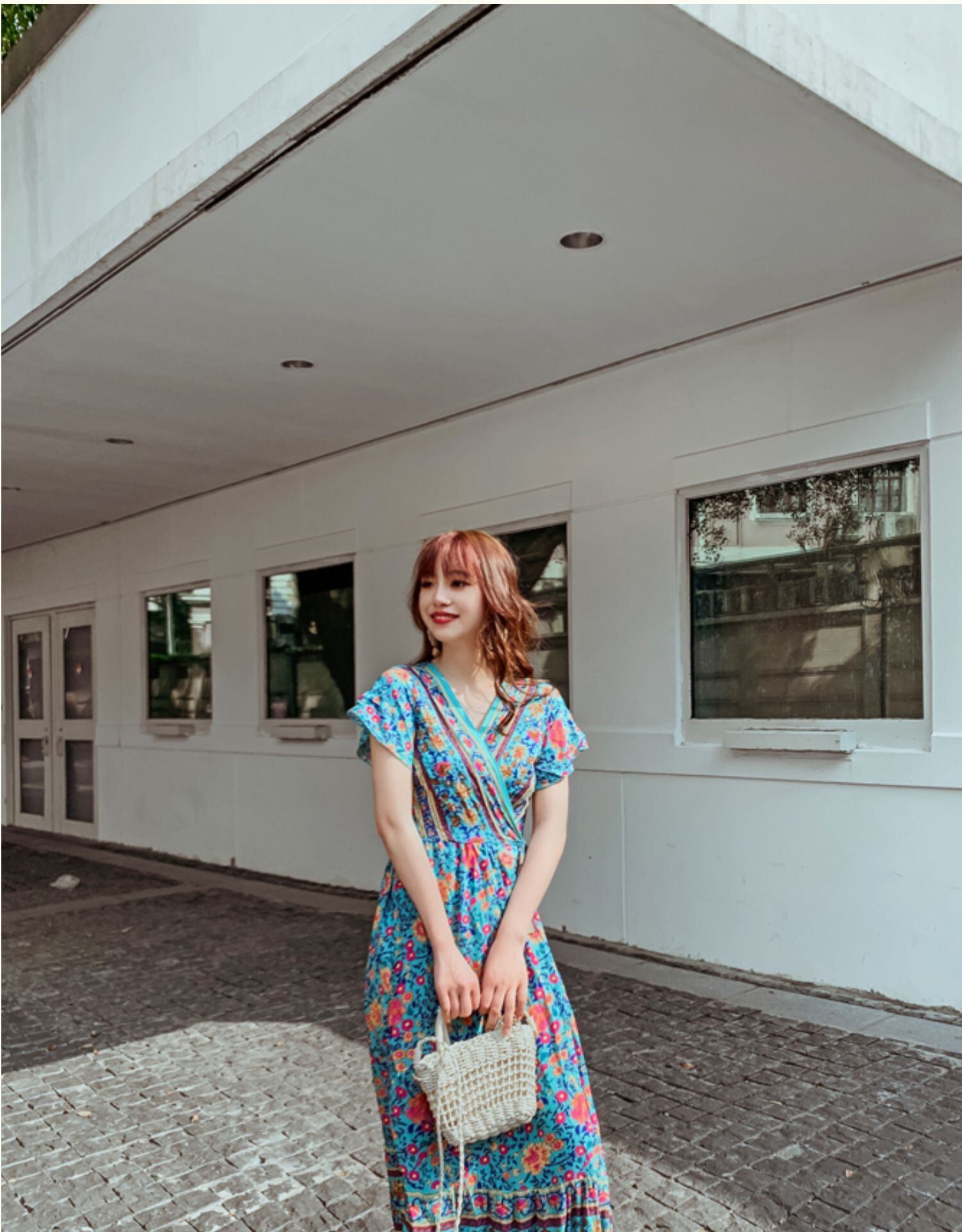 胸元がVネックになっていて、エスニックチックな印象のドレスは、春夏にぴったりのアイテム!