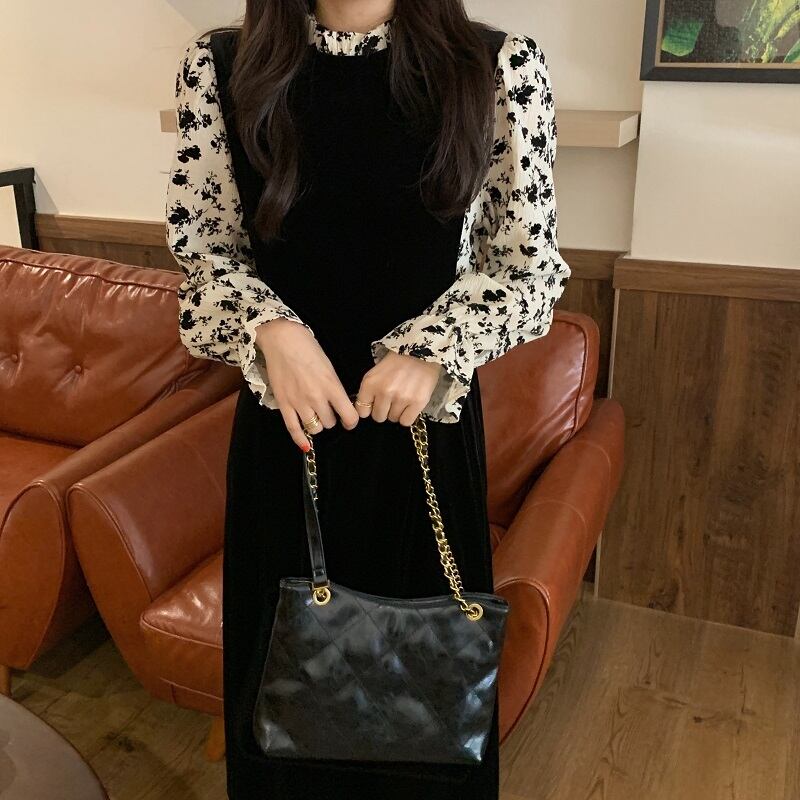 フェイクレイヤードワンピース 長袖 膝下丈 ミドル丈 花柄 フリル フレア Aライン ウエストマーク ハイウエスト ドレス 秋 重ね着風 ガーリー キュート ナチュラル ラブリー お出かけ イベント デート 女子会 エレガント フェミニン 大人可愛い 大人女子 おしゃれ お洒落 着回し カラー ブラック サイズ フリーサイズ
