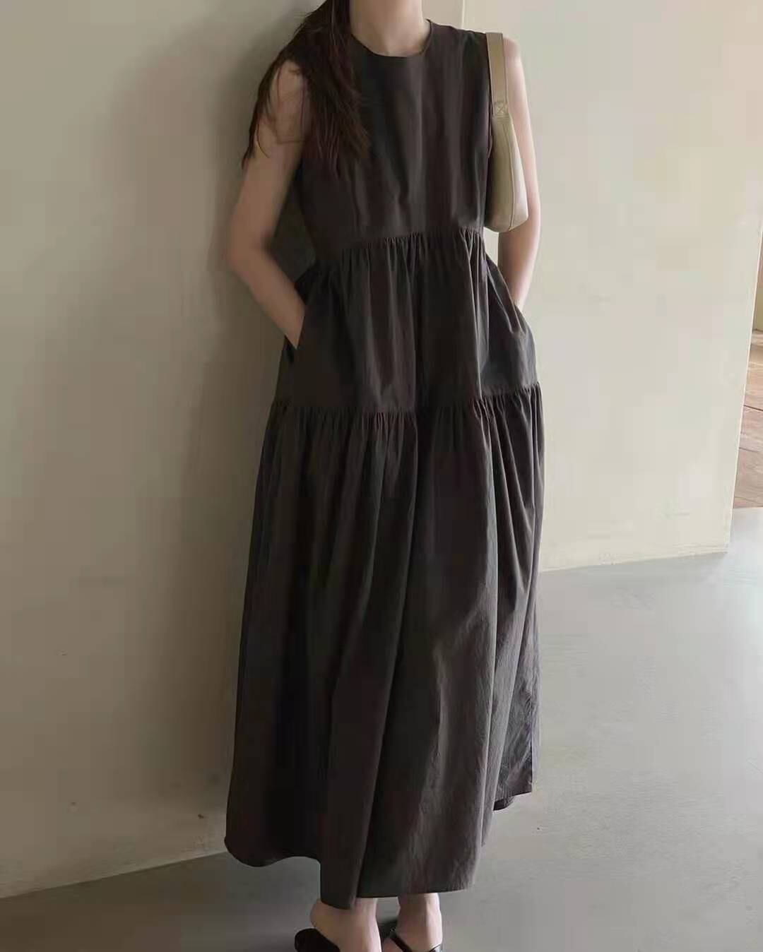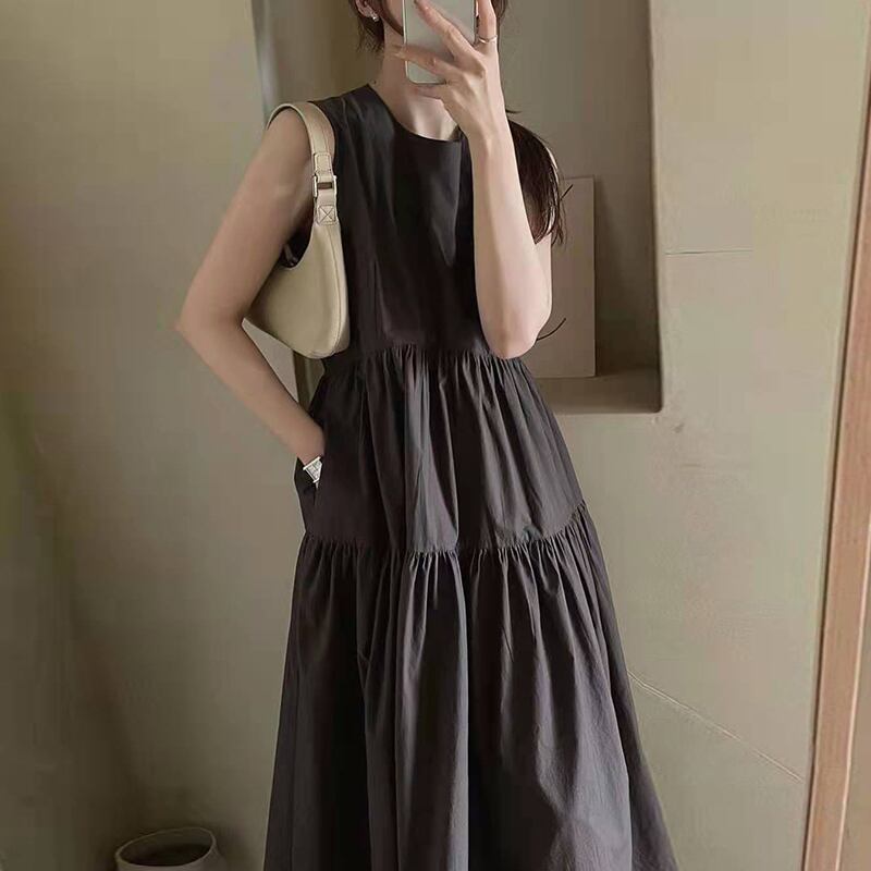 韓国ミニマリストフレンチカラープリーツカジュアルノースリーブロングドレスガール ワンピース ロング マキシ丈 ノースリーブ ラウンドネック Aライン ウエストマーク ハイウエスト ポリエステル 大人可愛い きれいめ シンプル カジュアル おしゃれ レトロ 大人女子 こなれ感 ラフ 無地 夏 10代 20代 30代 レディース OL 通勤 学生 通学 デート お出かけ 女子会 お泊まり 休日 リゾート 旅行 海 プール 高原 ガーデン 普段使い 重ね着 韓国 ホワイト ブラウン ベージュ