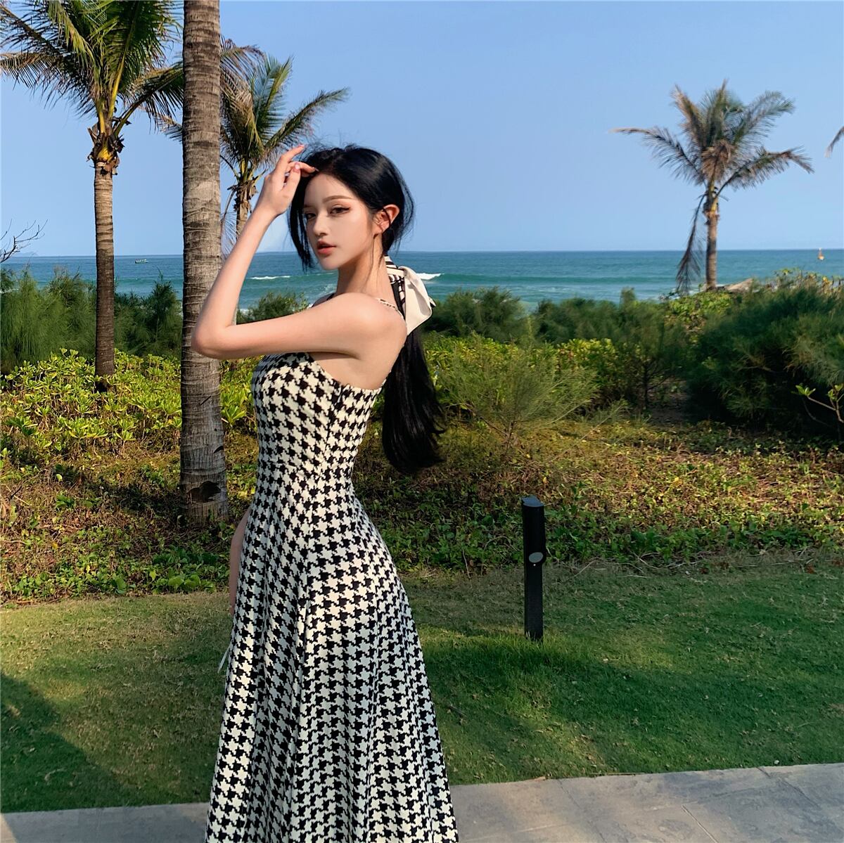 ハイウエストワンピ ワンピース ワンピドレス ミモレ ミモレ丈 ロング ロング丈 袖なし ノースリーブ スリム 細身 Aライン ウエストマーク スリット サイドスリット 切り替えデザイン かわいい おしゃれ お洒落 大人可愛い キュート ガーリー モード系 セクシー エレガント 主役級 柄 格子柄 千鳥格子 春 夏 10代 20代 30代 40代 レディース 女性用 パーティー イベント リゾート 旅行 海 韓国 韓国系 インスタ映え S M L XL 白 ホワイト 黒 ブラック 赤 レッド