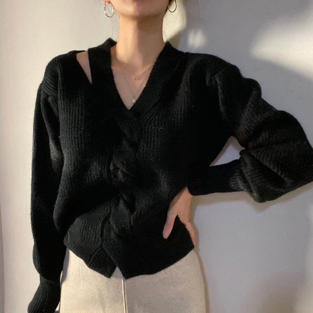 ショルダーのカッティングやロープ編みのようなデザインが美しいニット♪